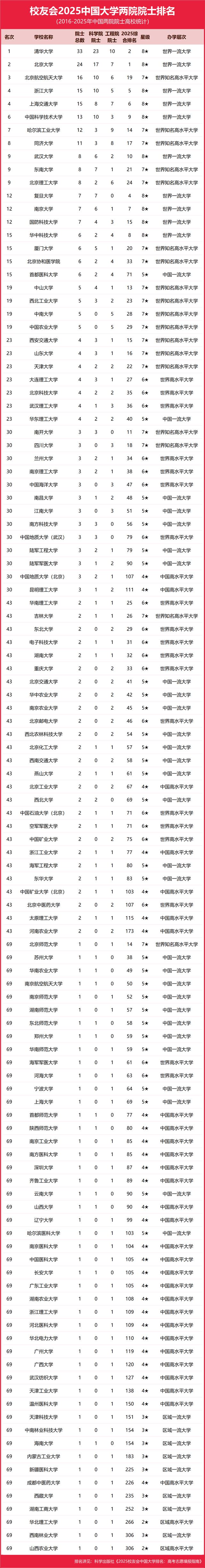 艾瑞深校友会2016-2025年中国两院院士高校统计 近日,2025年中国科学院院士、中国工程院院士增选结果正式揭晓,全国共有144人当选中国两院院士。 2025年11月24日,全国第三方大学评价机构艾瑞深校友会网(cuaa.net)公布2016-2025中国两院院士高校统计结果,最新发布校友会2025中国大学两院院士排名。 结果显示,双一流建设以来(2016-2025年),清华大学、北京大学师资队伍建设最具成效,分别有33人和24人当选中国科学院和中国工程院院士,雄居2025中国大学两院院士排名冠亚军。北京航空航天大学、浙江大学和上海交通大学挺进前五强。 中国科学院院士、中国工程院院士是中国科学技术与工程技术界的杰出代表和最高学术荣誉称号获得者,代表着中国自然科学研究领域顶尖人才和领军人物,中国两院院士指标是体现中国高校人才培养水平和师资队伍水平的核心指标。 校友会中国大学排名基于“大平台、大团队、大项目、大成果、大校友”体系框架对中国高校办学质量进行系统评价,至今已有23年的历史,已成为具有广泛社会影响力、公信力、参考价值与创新力的中国大学排名领先品牌。校友会2025中国大学两院院士排名统计对象为2016-2025年中国高校申报并当选中国科学院和中国工程院院士的教师。 清华大学、北京大学雄居2025中国大学两院院士排名冠亚军,北京航空航天大学力压群雄挺进前三 榜单显示,双一流建设以来(2016-2025年),清华大学申报当选的中国科学院院士和中国工程院院士人数最多,有33人,问鼎艾瑞深校友会2025中国大学两院院士排名冠军。北京大学24人,居第2;清华北大是我国人才培养质量水平、师资队伍水平最高的大学。 北京航空航天大学16人,列第3;浙江大学、上海交通大学各15人,并列第4;中国科学技术大学13人,列第6;哈尔滨工业大学12人,列第7;同济大学11人,列第8;武汉大学、东南大学、北京理工大学各8人当选中国两院院士,并列第9。 名列校友会2025中国大学两院院士排名前20强的其他大学依次是复旦大学、南京大学、国防科技大学、华中科技大学、厦门大学、北京协和医学院、首都医科大学、中山大学、西北工业大学、中南大学、中国农业大学等,当选中国两院院士的教师人数均在5人以上。 首都医科大学雄居2025中国双非大学两院院士排名冠军,燕山大学、河南农业大学等8校挺进全国50强 双一流建设以来,国家双一流建设高校当选中国两院院士的人数最多,非双一流高校表现也相当突出。全国共有首都医科大学、陆军工程大学、燕山大学、南方医科大学、齐鲁工业大学、深圳大学、河北医科大学、武汉纺织大学、内蒙古工业大学、湖南工商大学等29所非双一流高校上榜。 其中表现最好的是,首都医科大学有6名教师当选中国两院院士,超出部分985工程和211工程高校,位居全国第15名,雄居校友会2025中国双非大学两院院士排名首位。陆军工程大学、陆军军医大学和昆明理工大学各3人,并列第2,燕山大学、浙江工业大学、海军工程大学、河南农业大学并列第5,各有2名教师当选中国两院院士。 |