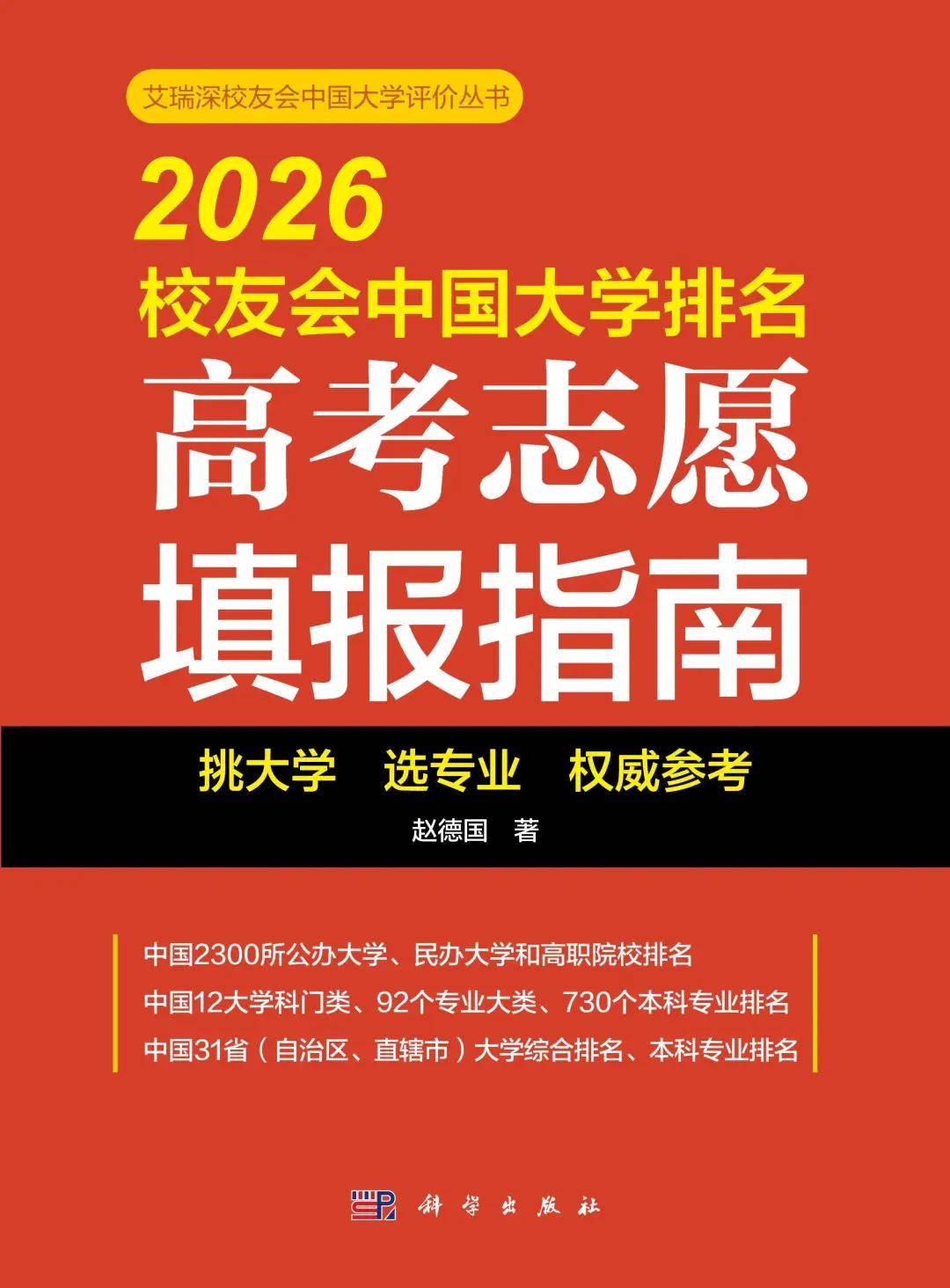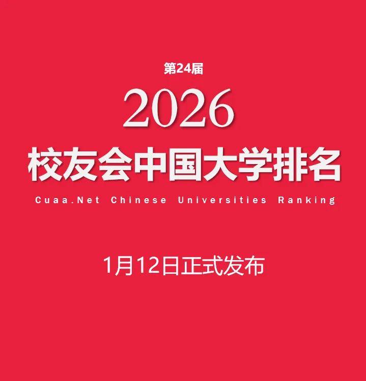 校友会2026中国大学排名将于明日(1月12日)正式发布,这将是艾瑞深校友会网(Cuaa.net)连续第24年发布校友会中国大学排名。 艾瑞深研究团队撰写、深受全国高考考生及家长欢迎的高考志愿填报参考书——《2026校友会中国大学排名:高考志愿填报指南》将于2026年3月由国内权威出版社科学出版社连续第9年公开出版发行。 校友会中国大学排名首发于2003年,至今已有24年的历史,已成为具有广泛社会影响力、公信力、参考价值和创新力的中国大学排名领先品牌。校友会中国大学排名是国内目前评价体系最为系统全面、客观独立,评价体系和评价方法最为稳定,评价指标和参评高校数量最多,最符合国家政策和价值导向的中国大学排名。 二十四年来,校友会中国大学排名相关研究成果被人民日报、中央电视台(CCTV)、光明日报、中国青年报、中国教育报、中国科学报、中国日报、新华网、人民网、百度、今日头条、新浪网、腾讯网、搜狐网和网易网等上百家权威新闻媒体广泛转载、报道和引用,在国内具有广泛的学术影响、社会声誉与良好的品牌口碑。 2026中国大学排名评价体系 一直以来,校友会中国大学排名坚决贯彻落实国家教育改革文件方针政策,坚持正确的教育政策导向和价值取向,坚持走中国特色自主创新道路,不崇洋媚外、不以偏概全、不照搬照抄复制他人的评价思想与评价方法。艾瑞深研究团队是国内第三方大学评价的引领者,校友会大学排名评价体系的独立性、创新性和前瞻性远远领先于其他大学排行,公开发表的校友会中国大学排名评价体系思想、分类分级分区评价方法被多家国内排名机构借鉴模仿。 校友会中国大学排名评价指标体系涵盖人才培养、科学研究、社会服务、文化传承创新、国际交流合作等五大核心职能。以服务国家“双一流”建设为导向,评估指标均与国家“双一流”建设目标要求相一致,推动中国大学内涵式发展,引导中国高校坚持以立德树人成效作为根本标准,扎根中国大地办大学,提升服务国家地方经济社会发展的能力,增强社会影响力与核心竞争力。 校友会2026中国大学排名评价指标体系由办学层次、思政教育、教学质量、高层次人才、杰出校友、学科专业、科研基地、科研项目、科研成果、社会服务、社会声誉和国际影响力等十二项一级指标组成,以艾瑞深大学360度全景数据平台为数据支持,基于“大平台、大团队、大项目、大成果、大校友”体系框架展开系统评价,涵盖的评价指标高达900多项,是目前中国评价指标最多的中国大学排名。 校友会中国大学排名主持人赵德国指出,与国内外其他排行相比,校友会中国大学排名的评价结果更符合国家教育政策导向,指标更加全面,对全国广大高考考生和家长更具参考价值和指导意义。 校友会中国大学排名是国内最早实施中国大学分类评价的大学排行榜。1989年,艾瑞深中国大学评价研究团队首席专家、中南大学蔡言厚教授领导创建的大学评价课题组公开发表学术论文,发布中国第1个综合实力大学排名;在国内率先将中国高校划分为理工、综合、医科与农林等类型进行分类评价,对外公布了4个单科性大学排名,正式拉开中国大学排名分类评价的序幕。 30多年来,作为中国大学排名分类评价领域的引领者,艾瑞深中国大学评价研究团队不断完善校友会中国大学分类评价方法。2013年,首次公开发布“校友会中国大学分类体系标准”。2026年,坚决贯彻落实《教育强国建设规划纲要(2024—2035年)》文件要求,按照中国大学的人才培养类型、学术研究水平、辐射区域和办学定位,将中国大学划分为研究型、区域研究型、应用型和技能型等四种类型,引导中国高校科学定位、合理分类、走差异化发展道路,争创中国特色、世界一流大学,增强其服务全球国家地方经济社会发展的能力。 2020年,在国内率先提出中国大学排名分类评价新方案,便于广大读者科学客观对比分析不同排名中院校的全国排名情况,引导中国大学科学定位、办出特色。 校友会2026中国大学排名评价结果按照主榜、总榜进行评价和呈现。在2026年中国大学综合实力排名中,理工类、综合类、农林类和财经类等类型高校纳入主榜进行全国综合实力评价和呈现。艺术类、体育类、政法类、语言类、师范类、医药类、民族类和中外合作办学院校等人才培养和学科专业相对单一的院校分别进行综合评价,综合其办学水平及实力得分给出参评高校的全国参考排名,纳入2026中国大学排名(总榜)进行呈现。 在校友会2026中国民办高校评价中,将民办高校按照研究型和应用型两个类型进行评价。其中,民办研究型大学纳入2026中国大学排名(总榜)进行评价。民办应用型大学纳入2026中国民办大学排名(应用型)进行评价,依据参评中国民办高校(含独立学院)优势学科与专业所属门类,按照I类、Ⅱ类、Ⅲ类等3个类型进行分类评价。其中,Ⅰ类高校为以工学门类学科专业为优势的院校,Ⅱ类高校为以理学及人文社科门类学科专业为优势的院校,Ⅲ类高校为以体育、艺术、经济、管理、教育学、农学、医学等门类学科专业为优势的院校。 在校友会2026中国高职院校评价中,依据参评院校优势学科专业所属门类,将中国高职(专科)院校分为I类、Ⅱ类和Ⅲ类等3个类型进行分类评价。其中,Ⅰ类院校为以工学门类学科专业为优势的院校,Ⅱ类院