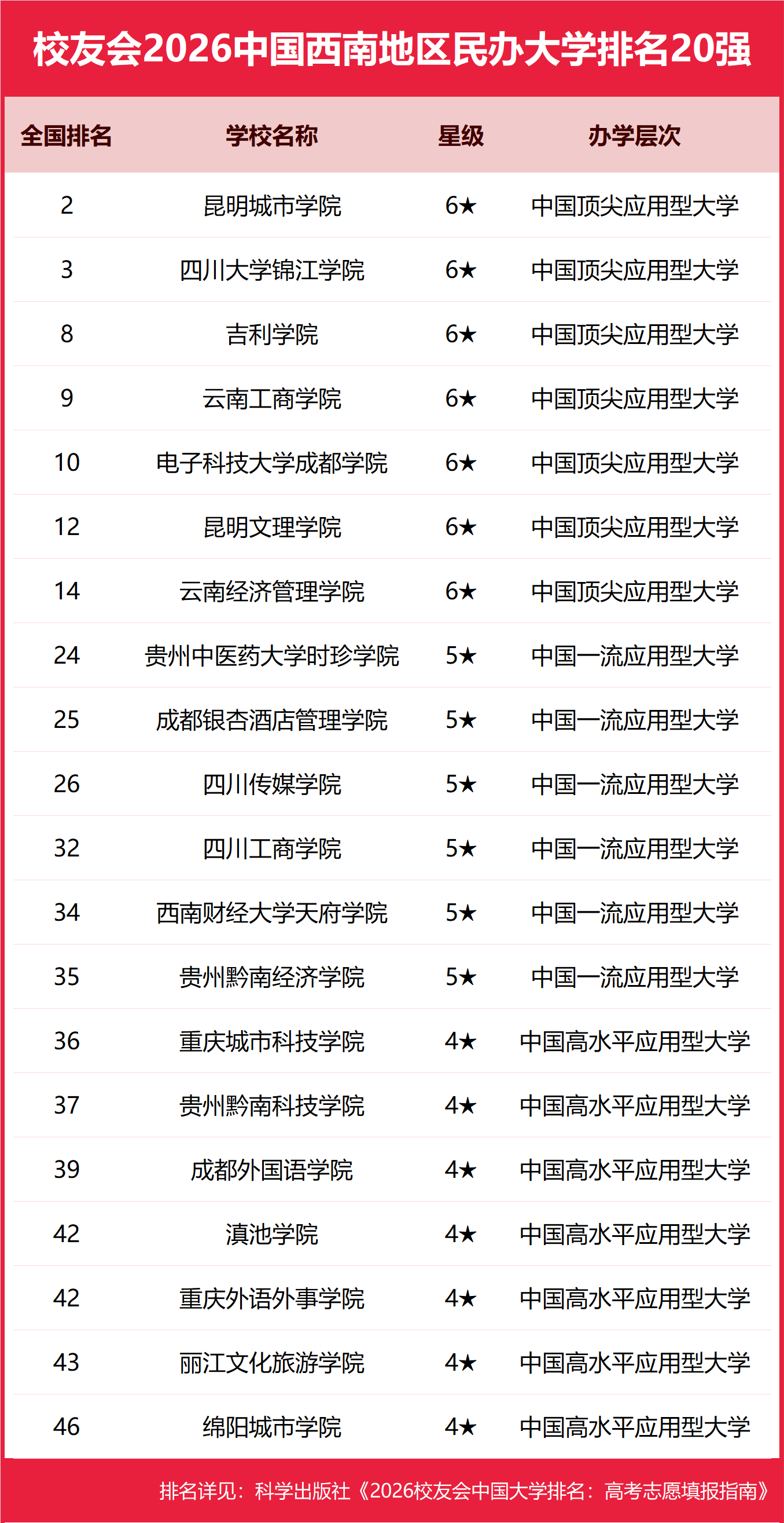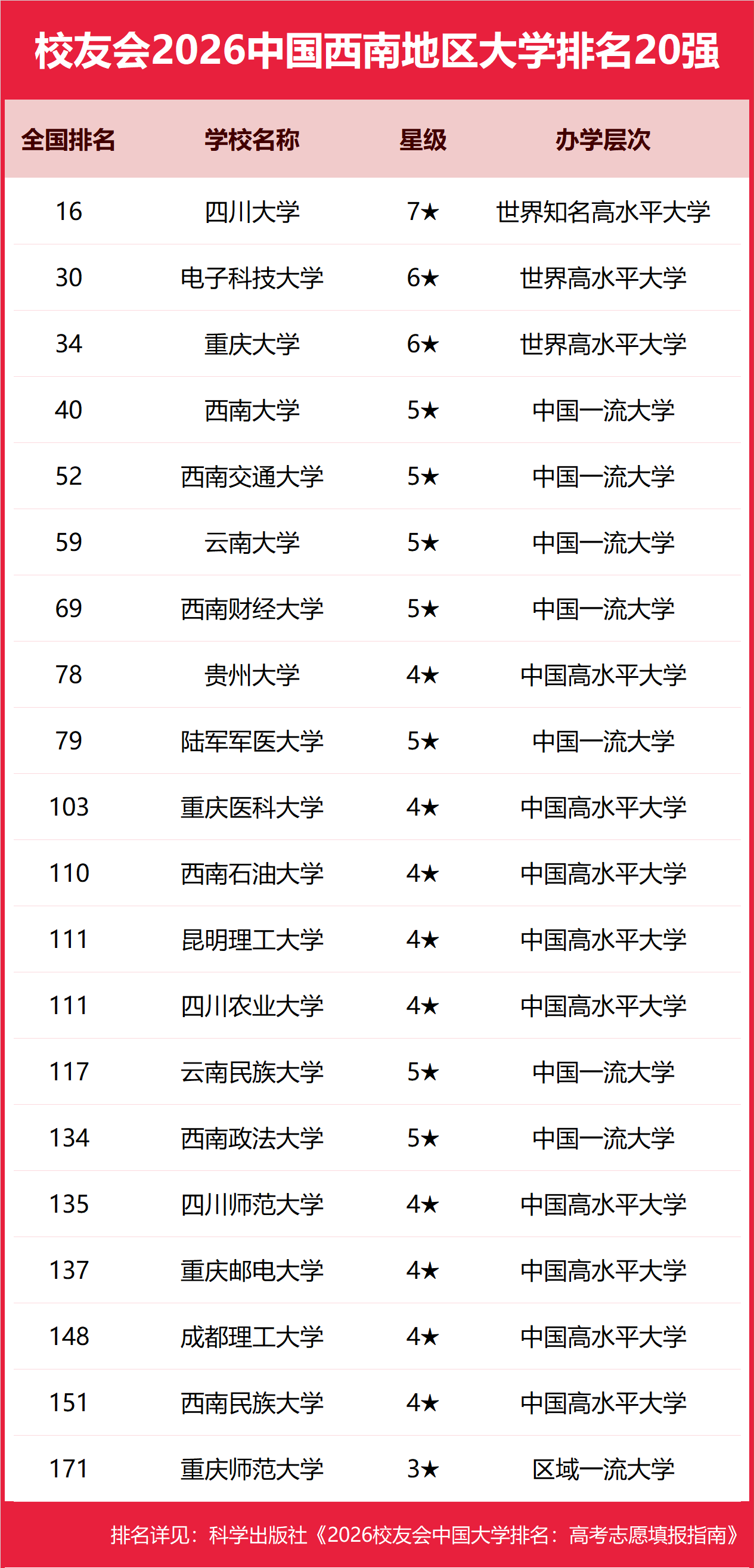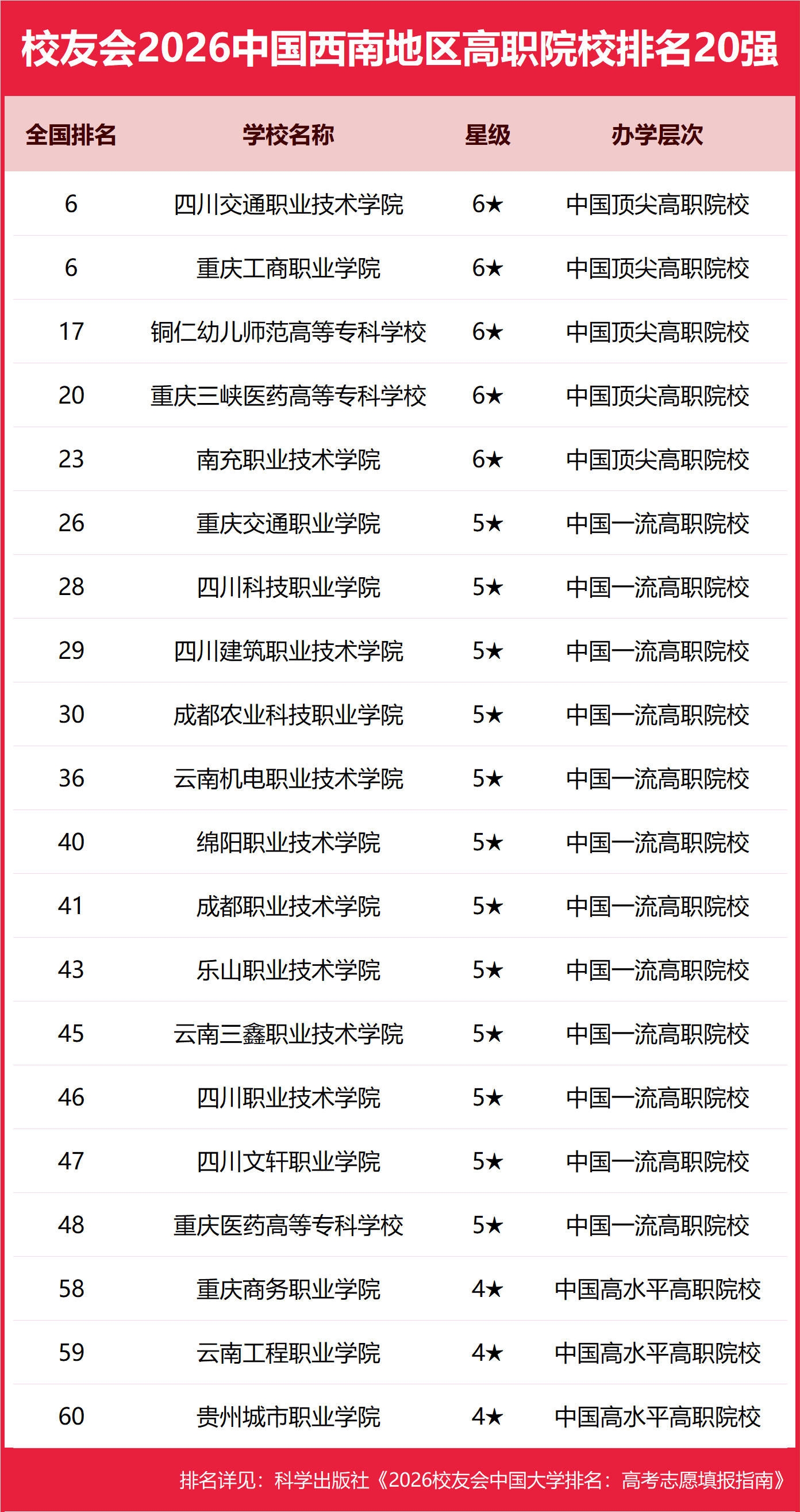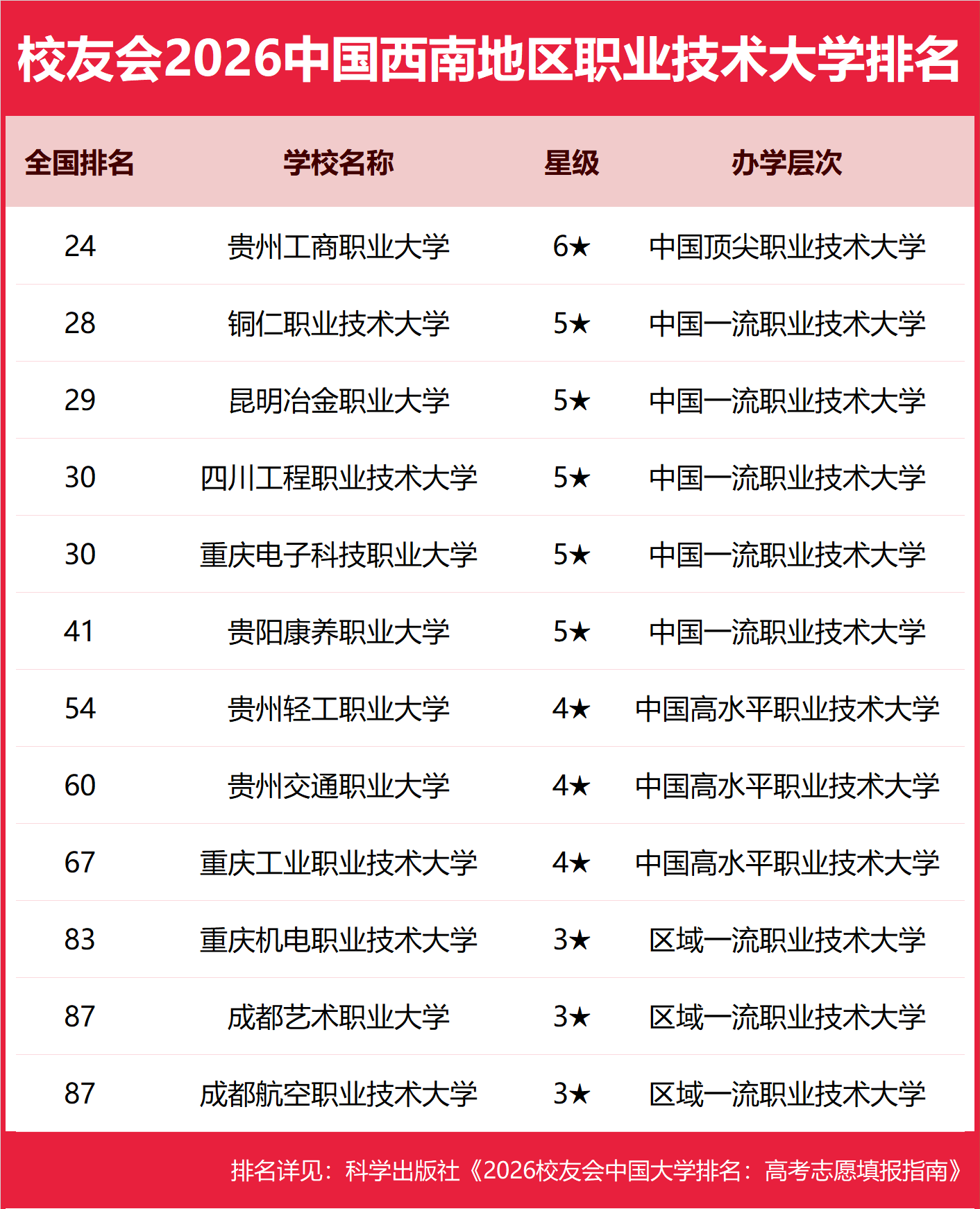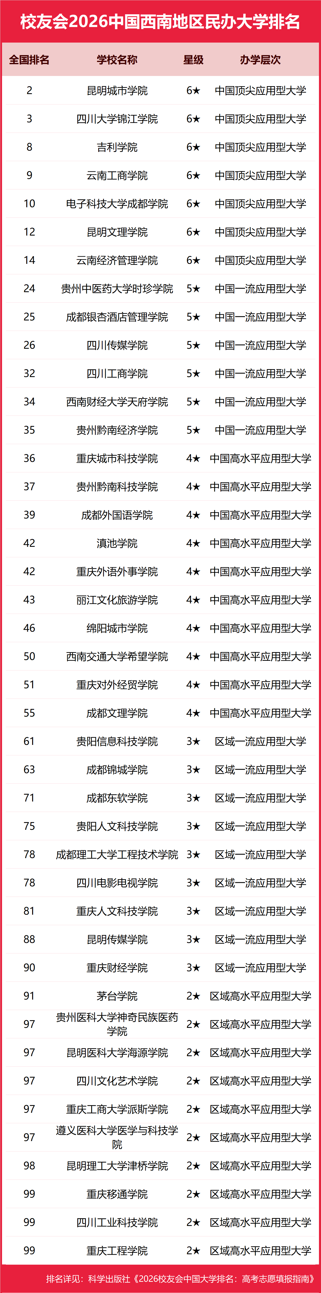 | 校友会2026年中国西南地区大学排名,四川大学、昆明城市学院、贵州工商职业大学、四川交通职业技术学院、重庆工商职业学院第一 | |||