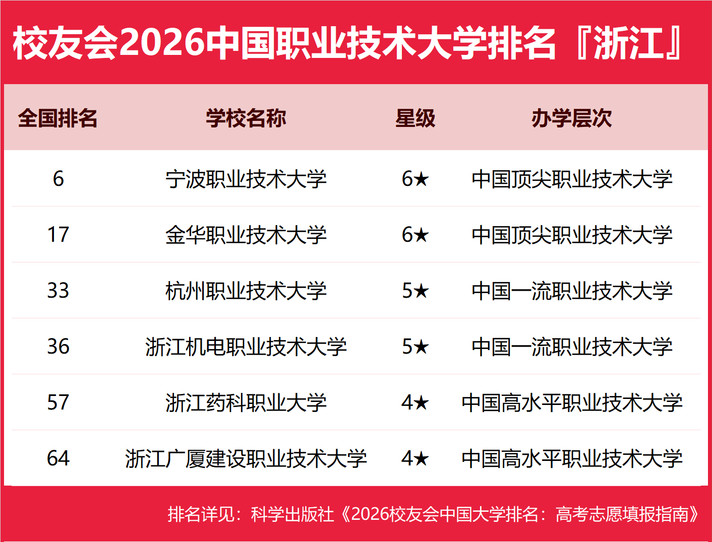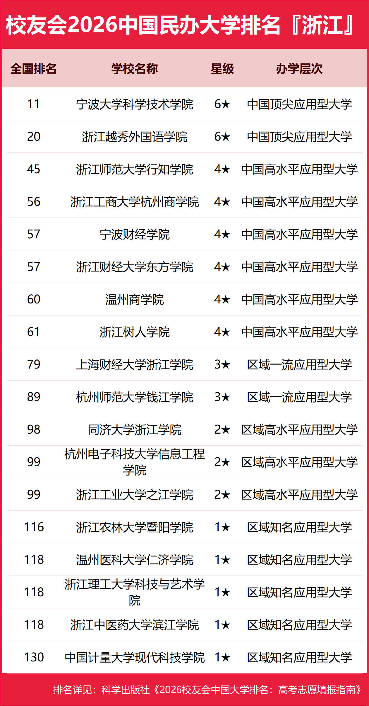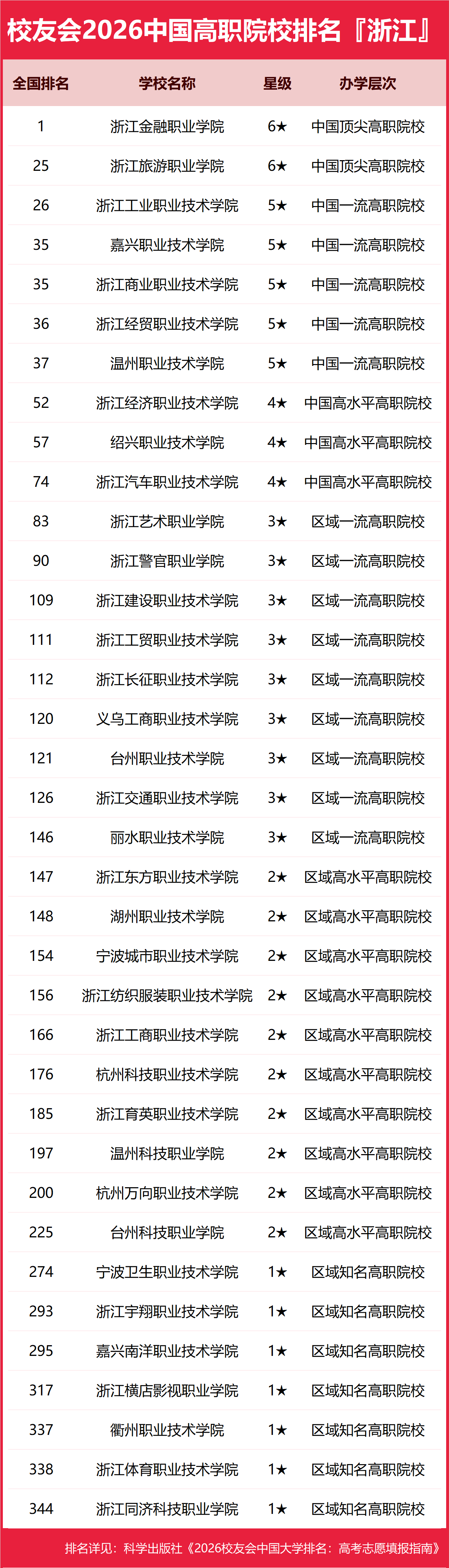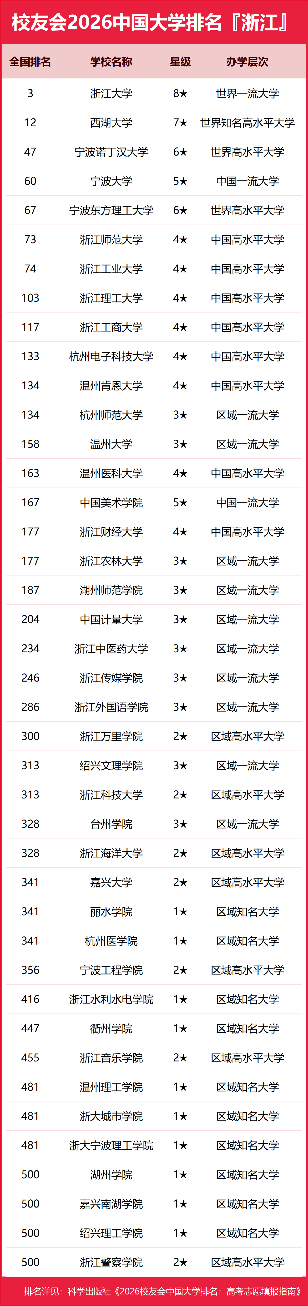 为了给2026年全国高考考生报考浙江省高校提供参考指南,2026年1月12日,全国第三方大学评价机构艾瑞深校友会网(Cuaa.net)撰写完成、科学出版社即将出版的《2026校友会中国大学排名:高考志愿填报指南》最新发布校友会2026浙江省大学排名。北京大学连续20年蝉联中国大学排名冠军,稳居霸主地位,问鼎2026中国大学排名榜首。清华大学第二,中国科学院大学和浙江大学并列第三,西湖大学、南方科技大学和上海科技大学挺进全国20强;福耀科技大学首次纳入中国大学排名,跻身全国50强。 科学出版社《2026校友会中国大学排名:高考志愿填报指南》 榜单显示,浙江大学问鼎校友会2026浙江省大学排名首位,宁波大学科学技术学院位列2026浙江省民办大学排名第一,宁波职业技术大学位居2026浙江省职业技术大学排名榜首,浙江金融职业学院问鼎2026浙江省高职院校排名冠军。 西交利物浦大学、宁波诺丁汉大学、香港中文大学(深圳)位列2026中国合作办学大学排名前三甲。武昌首义学院、三亚学院、西安欧亚学院、广州南方学院位列2026中国民办大学排名首位。深圳职业技术大学、海南科技职业大学、河北科技工程职业技术大学雄居2026中国职业技术大学排名前三甲。江西应用技术职业学院、合肥职业技术学院、浙江金融职业学院位列2026中国高职院校排名榜首。 校友会2026中国大学排名评价指标体系 浙江大学雄居2026浙江省大学排名第一,宁波东方理工大学挺进前5强 在最新校友会2026中国大学排名中,浙江大学全国排名第3名,雄居2026浙江省大学排名第一。西湖大学第2,宁波诺丁汉大学第3。名列前10强的其他高校为宁波大学、宁波东方理工大学、浙江师范大学、浙江工业大学、浙江理工大学、浙江工商大学、杭州电子科技大学。 宁波大学科学技术学院雄居2026浙江省民办大学排名第一,浙江财经大学东方学院跻身前10强 在校友会2026中国民办大学排名中,宁波大学科学技术学院全国排名第11名,雄居2026浙江省民办大学排名第一。浙江越秀外国语学院第2,浙江师范大学行知学院居第3。名列前10强的其他民办高校为浙江工商大学杭州商学院、宁波财经学院、浙江财经大学东方学院、温州商学院、浙江树人学院、上海财经大学浙江学院、杭州师范大学钱江学院。 宁波职业技术大学雄居2026浙江省职业技术大学排名第一,金华职业技术大学跻身前3强 在校友会2026中国职业技术大学排名中,宁波职业技术大学全国排名第6名,雄居2026浙江省职业技术大学排名第一。金华职业技术大学列第2,杭州职业技术大学居第3。名列前10强的其他职业技术大学为浙江机电职业技术大学、浙江药科职业大学、浙江广厦建设职业技术大学。 浙江金融职业学院雄居2026浙江省高职院校排名第一,浙江旅游职业学院跻身前3强 在校友会2026中国高职院校排名中,浙江金融职业学院全国排名第1名,雄居2026浙江省高职院校排名第一。浙江旅游职业学院第2,浙江工业职业技术学院第3。名列前10强的其他高职院校为嘉兴职业技术学院、浙江商业职业技术学院、浙江经贸职业技术学院、温州职业技术学院、浙江经济职业技术学院、绍兴职业技术学院、浙江汽车职业技术学院。 |