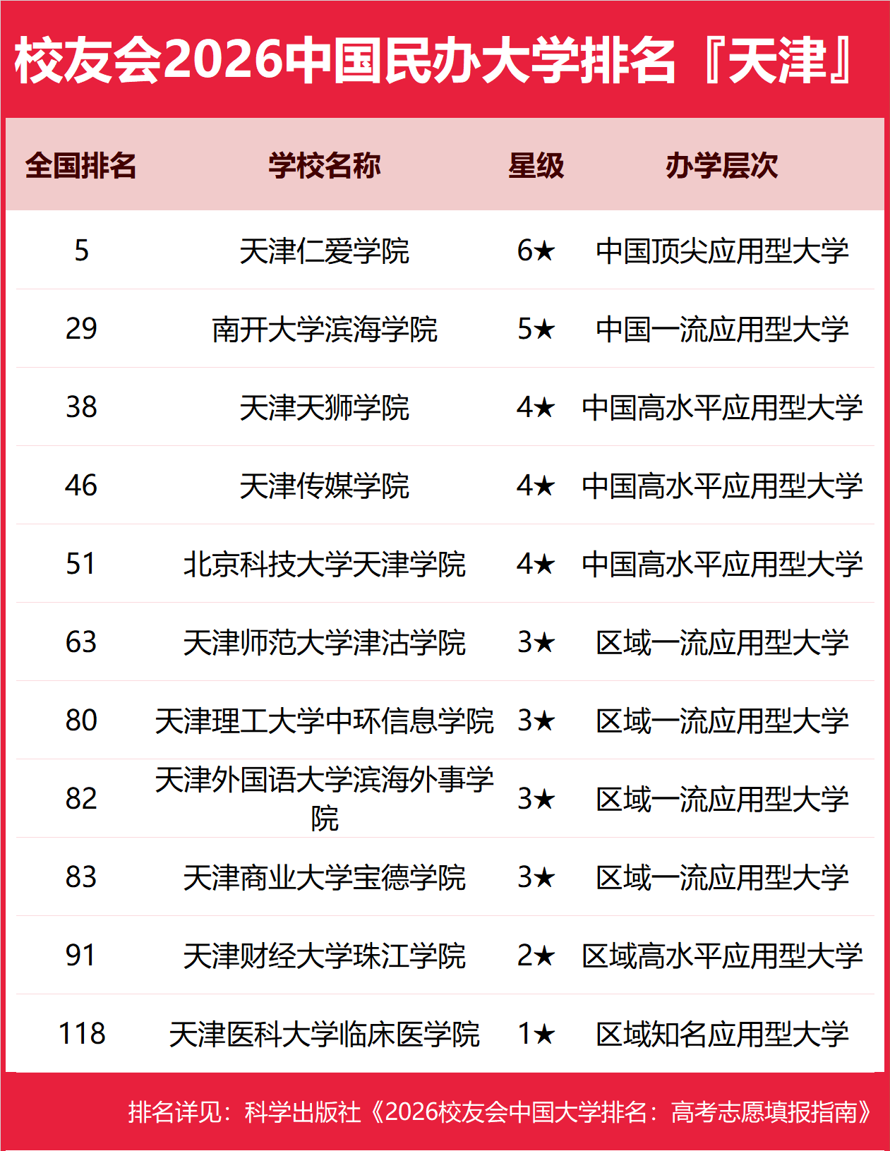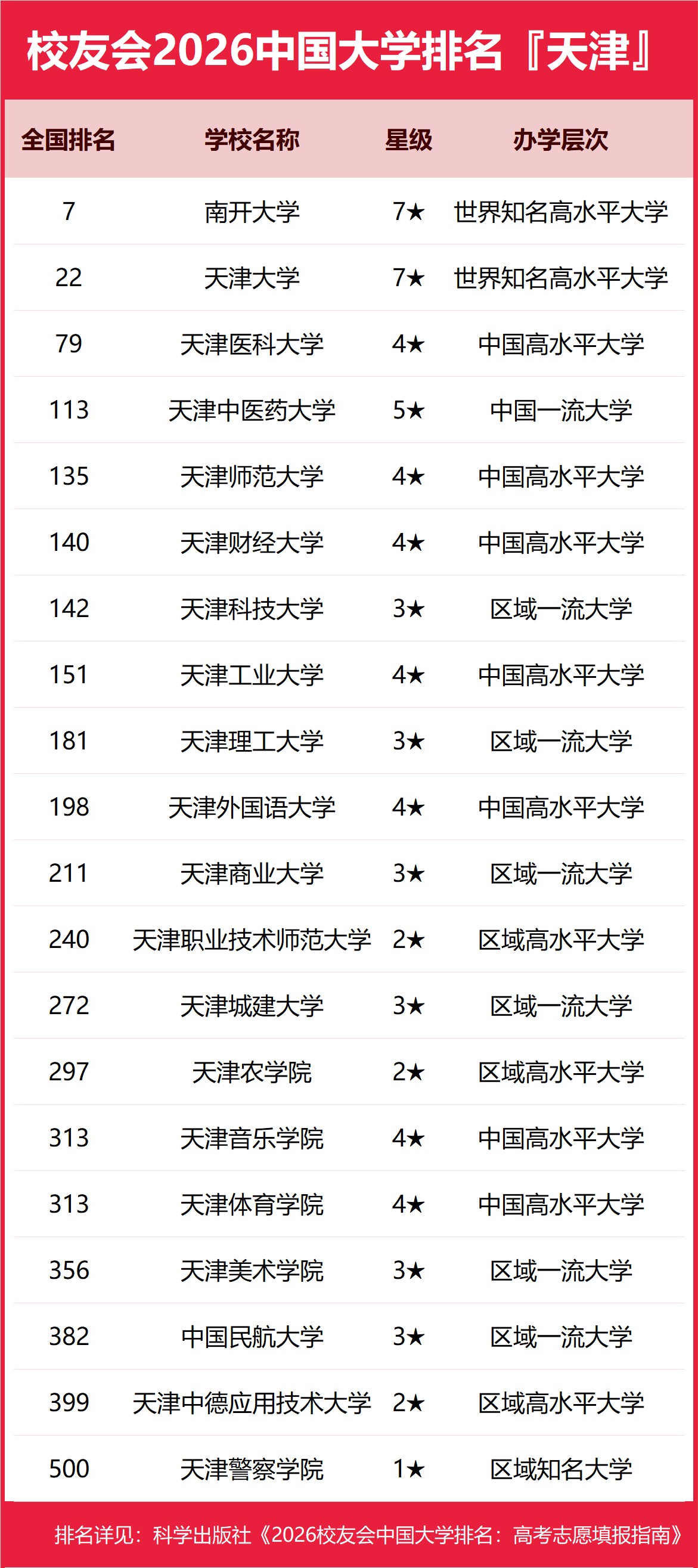 为了给2026年全国高考考生报考天津市高校提供参考指南,2026年1月12日,全国第三方大学评价机构艾瑞深校友会网(Cuaa.net)撰写完成、科学出版社即将出版的《2026校友会中国大学排名:高考志愿填报指南》最新发布校友会2026天津市大学排名。北京大学连续20年蝉联中国大学排名冠军,稳居霸主地位,问鼎2026中国大学排名榜首。清华大学第二,中国科学院大学和浙江大学并列第三,西湖大学、南方科技大学和上海科技大学挺进全国20强;福耀科技大学首次纳入中国大学排名,跻身全国50强。 科学出版社《2026校友会中国大学排名:高考志愿填报指南》 榜单显示,南开大学问鼎校友会2026天津市大学排名首位,天津仁爱学院位列2026天津市民办大学排名第一,天津职业大学位居2026天津市职业技术大学排名榜首,天津轻工职业技术学院问鼎2026天津市高职院校排名冠军。 西交利物浦大学、宁波诺丁汉大学、香港中文大学(深圳)位列2026中国合作办学大学排名前三甲。武昌首义学院、三亚学院、西安欧亚学院、广州南方学院位列2026中国民办大学排名首位。深圳职业技术大学、海南科技职业大学、河北科技工程职业技术大学雄居2026中国职业技术大学排名前三甲。江西应用技术职业学院、合肥职业技术学院、浙江金融职业学院位列2026中国高职院校排名榜首。 校友会2026中国大学排名评价指标体系 南开大学雄居2026天津市大学排名第一,天津大学第2 在最新校友会2026中国大学排名中,南开大学全国排名第7名,雄居2026天津市大学排名第一。天津大学第2,天津医科大学第3。名列前10强的其他高校为天津中医药大学、天津师范大学、天津科技大学、天津工业大学、天津理工大学、天津外国语大学、天津财经大学。 天津仁爱学院雄居2026天津市民办大学排名第一,南开大学滨海学院跻身前3强 在校友会2026中国民办大学排名中,天津仁爱学院全国排名第5名,雄居2026天津市民办大学排名第一。南开大学滨海学院第2,天津天狮学院居第3。名列前10强的其他民办高校为天津传媒学院、北京科技大学天津学院、天津师范大学津沽学院、天津外国语大学滨海外事学院、天津商业大学宝德学院、天津财经大学珠江学院。 天津职业大学雄居2026天津市职业技术大学排名第一 在校友会2026中国职业技术大学排名中,天津职业大学全国排名第30名,雄居2026天津市职业技术大学排名第一。 天津轻工职业技术学院雄居2026天津市高职院校排名第一,天津电子信息职业技术学院跻身前3强 在校友会2026中国高职院校排名中,天津轻工职业技术学院全国排名第4名,雄居2026天津市高职院校排名第一。天津医学高等专科学校第2,天津电子信息职业技术学院第3。名列前10强的其他高职院校为天津现代职业技术学院、天津渤海职业技术学院、天津商务职业学院、天津机电职业技术学院、天津交通职业学院、天津滨海职业学院、天津海运职业学院。 |