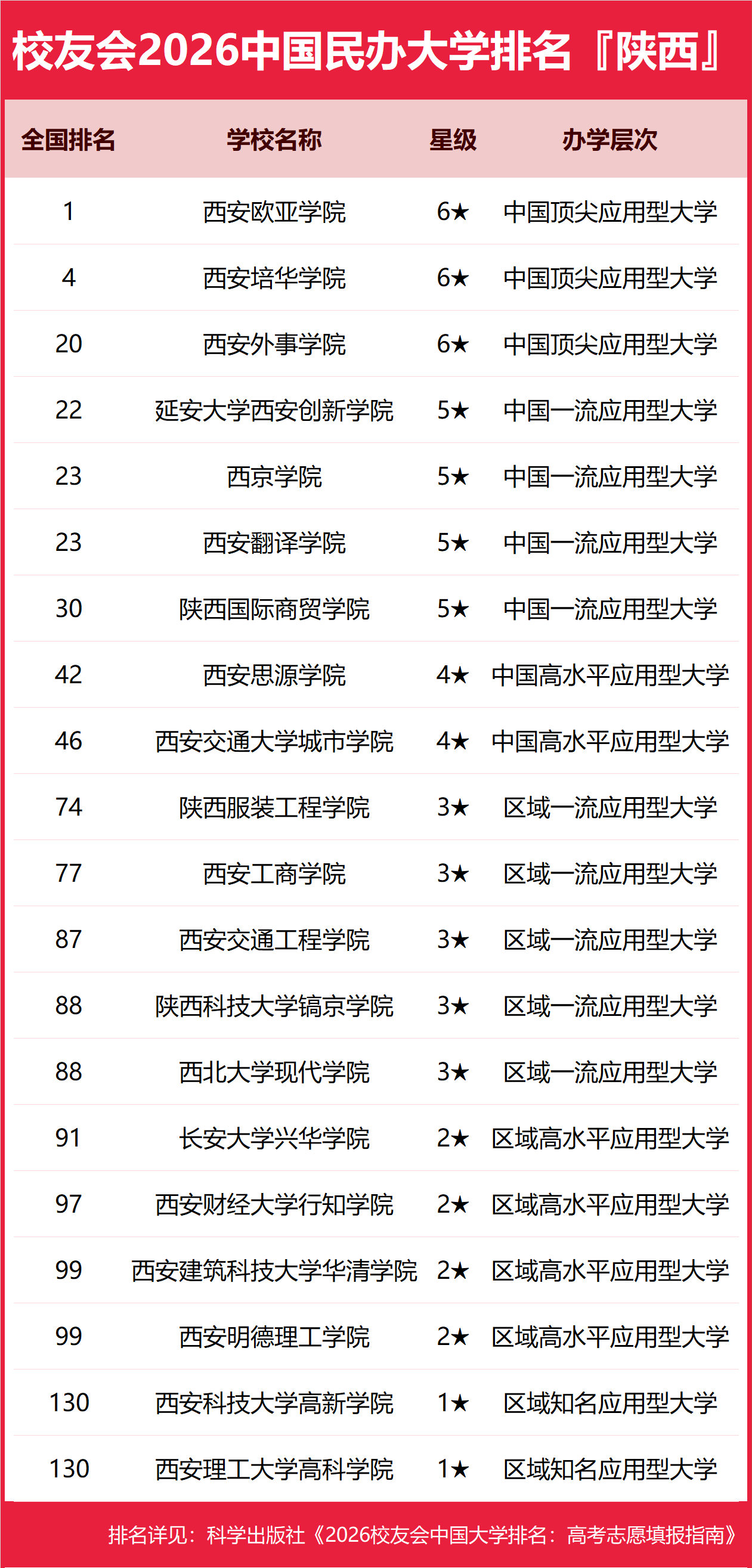为了给2026年全国高考考生报考陕西省高校提供参考指南,2026年1月12日,全国第三方大学评价机构艾瑞深校友会网(Cuaa.net)撰写完成、科学出版社即将出版的《2026校友会中国大学排名:高考志愿填报指南》最新发布校友会2026陕西省大学排名。北京大学连续20年蝉联中国大学排名冠军,稳居霸主地位,问鼎2026中国大学排名榜首。清华大学第二,中国科学院大学和浙江大学并列第三,西湖大学、南方科技大学和上海科技大学挺进全国20强;福耀科技大学首次纳入中国大学排名,跻身全国50强。 科学出版社《2026校友会中国大学排名:高考志愿填报指南》 榜单显示,西安交通大学问鼎校友会2026陕西省大学排名首位,西安欧亚学院位列2026陕西省民办大学排名第一,西安汽车职业大学位居2026陕西省职业技术大学排名榜首,陕西铁路工程职业技术学院问鼎2026陕西省高职院校排名冠军。 西交利物浦大学、宁波诺丁汉大学、香港中文大学(深圳)位列2026中国合作办学大学排名前三甲。武昌首义学院、三亚学院、西安欧亚学院、广州南方学院位列2026中国民办大学排名首位。深圳职业技术大学、海南科技职业大学、河北科技工程职业技术大学雄居2026中国职业技术大学排名前三甲。江西应用技术职业学院、合肥职业技术学院、浙江金融职业学院位列2026中国高职院校排名榜首。 校友会2026中国大学排名评价指标体系 西安交通大学雄居2026陕西省大学排名第一,陕西师范大学挺进前10强 在最新校友会2026中国大学排名中,西安交通大学全国排名第13名,雄居2026陕西省大学排名第一。西北工业大学第2,西安电子科技大学第3。名列前10强的其他高校为西北农林科技大学、空军工程大学、空军军医大学、西北大学、陕西师范大学、长安大学、西安理工大学。 西安欧亚学院雄居2026陕西省民办大学排名第一,西安培华学院第2,延安大学西安创新学院跻身前3强 在校友会2026中国民办大学排名中,西安欧亚学院全国排名第1名,雄居2026陕西省民办大学排名第一。西安培华学院第2,西安外事学院居第3。名列前10强的其他民办高校为延安大学西安创新学院、西京学院、西安翻译学院、陕西国际商贸学院、西安思源学院、西安交通大学城市学院、陕西服装工程学院。 西安汽车职业大学雄居2026陕西省职业技术大学排名第一,西安信息职业大学院跻身前3强 在校友会2026中国职业技术大学排名中,西安汽车职业大学全国排名第10名,雄居2026陕西省职业技术大学排名第一。陕西工业职业技术大学列第2,西安信息职业大学居第3。名列前10强的其他职业技术大学为陕西农林职业技术大学。 陕西铁路工程职业技术学院雄居2026陕西省高职院校排名第一,陕西职业技术学院跻身前3强 在校友会2026中国高职院校排名中,陕西铁路工程职业技术学院全国排名第4名,雄居2026陕西省高职院校排名第一。陕西职业技术学院第2,宝鸡职业技术学院第3。名列前10强的其他高职院校为西安医学高等专科学校、陕西国防工业职业技术学院、西安航空职业技术学院、延安职业技术学院、西安职业技术学院、咸阳职业技术学院、汉中职业技术学院。 |