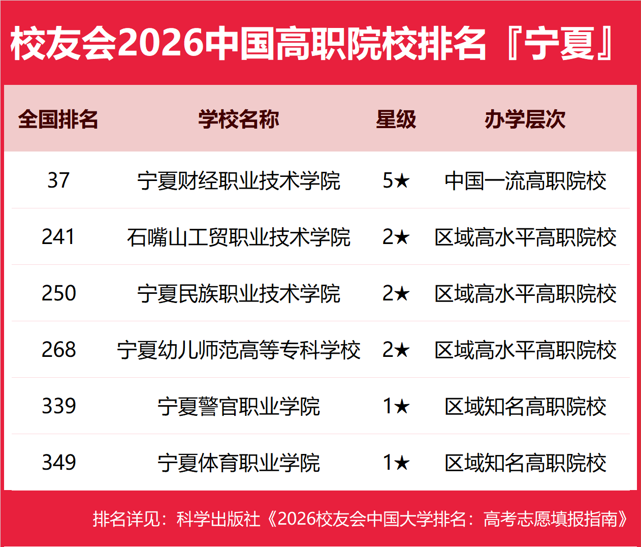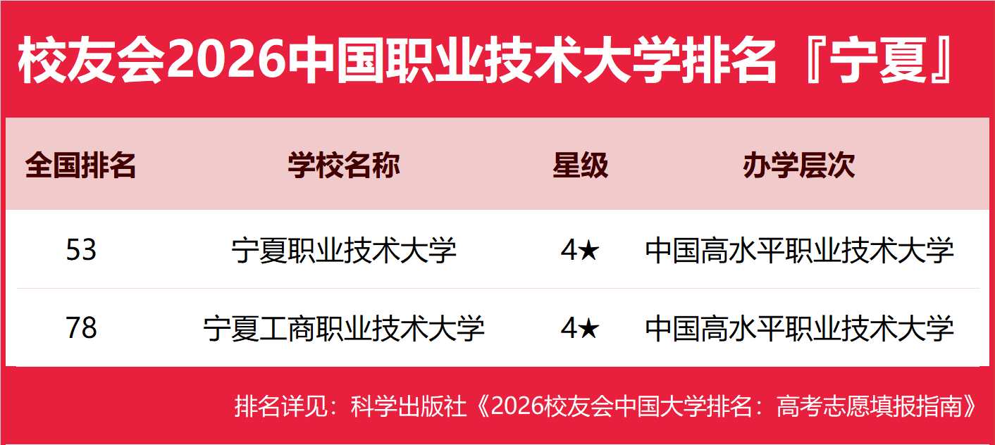为了给2026年全国高考考生报考宁夏回族自治区高校提供参考指南,2026年1月12日,全国第三方大学评价机构艾瑞深校友会网(Cuaa.net)撰写完成、科学出版社即将出版的《2026校友会中国大学排名:高考志愿填报指南》最新发布校友会2026宁夏回族自治区大学排名。北京大学连续20年蝉联中国大学排名冠军,稳居霸主地位,问鼎2026中国大学排名榜首。清华大学第二,中国科学院大学和浙江大学并列第三,西湖大学、南方科技大学和上海科技大学挺进全国20强;福耀科技大学首次纳入中国大学排名,跻身全国50强。 科学出版社《2026校友会中国大学排名:高考志愿填报指南》 榜单显示,宁夏大学问鼎校友会2026宁夏回族自治区大学排名首位,宁夏理工学院位列2026宁夏回族自治区民办大学排名第一,宁夏职业技术大学位居2026宁夏回族自治区职业技术大学排名榜首,宁夏财经职业技术学院问鼎2026宁夏回族自治区高职院校排名冠军。 西交利物浦大学、宁波诺丁汉大学、香港中文大学(深圳)位列2026中国合作办学大学排名前三甲。武昌首义学院、三亚学院、西安欧亚学院、广州南方学院位列2026中国民办大学排名首位。深圳职业技术大学、海南科技职业大学、河北科技工程职业技术大学雄居2026中国职业技术大学排名前三甲。江西应用技术职业学院、合肥职业技术学院、浙江金融职业学院位列2026中国高职院校排名榜首。 校友会2026中国大学排名评价指标体系 宁夏大学雄居2026宁夏回族自治区大学排名第一,北方民族大学第2 在最新校友会2026中国大学排名中,宁夏大学全国排名第169名,雄居2026宁夏回族自治区大学排名第一。北方民族大学第2,宁夏医科大学第3。名列前10强的其他高校为宁夏师范大学。 宁夏理工学院雄居2026宁夏回族自治区民办大学排名第一,银川能源学院跻身前10强 在校友会2026中国民办大学排名中,宁夏理工学院全国排名第62名,雄居2026宁夏回族自治区民办大学排名第一。宁夏大学新华学院第2,银川能源学院居第3。名列前10强的其他民办高校为银川科技学院。 宁夏职业技术大学雄居2026宁夏回族自治区职业技术大学排名第一,宁夏工商职业技术大学院跻身前3强 在校友会2026中国职业技术大学排名中,宁夏职业技术大学全国排名第53名,雄居2026宁夏回族自治区职业技术大学排名第一。宁夏工商职业技术大学列第2。 宁夏财经职业技术学院雄居2026宁夏回族自治区高职院校排名第一,宁夏民族职业技术学院跻身前3强 在校友会2026中国高职院校排名中,宁夏财经职业技术学院全国排名第37名,雄居2026宁夏回族自治区高职院校排名第一。石嘴山工贸职业技术学院第2,宁夏民族职业技术学院第3。名列前10强的其他高职院校为宁夏幼儿师范高等专科学校、宁夏警官职业学院、宁夏体育职业学院。 |