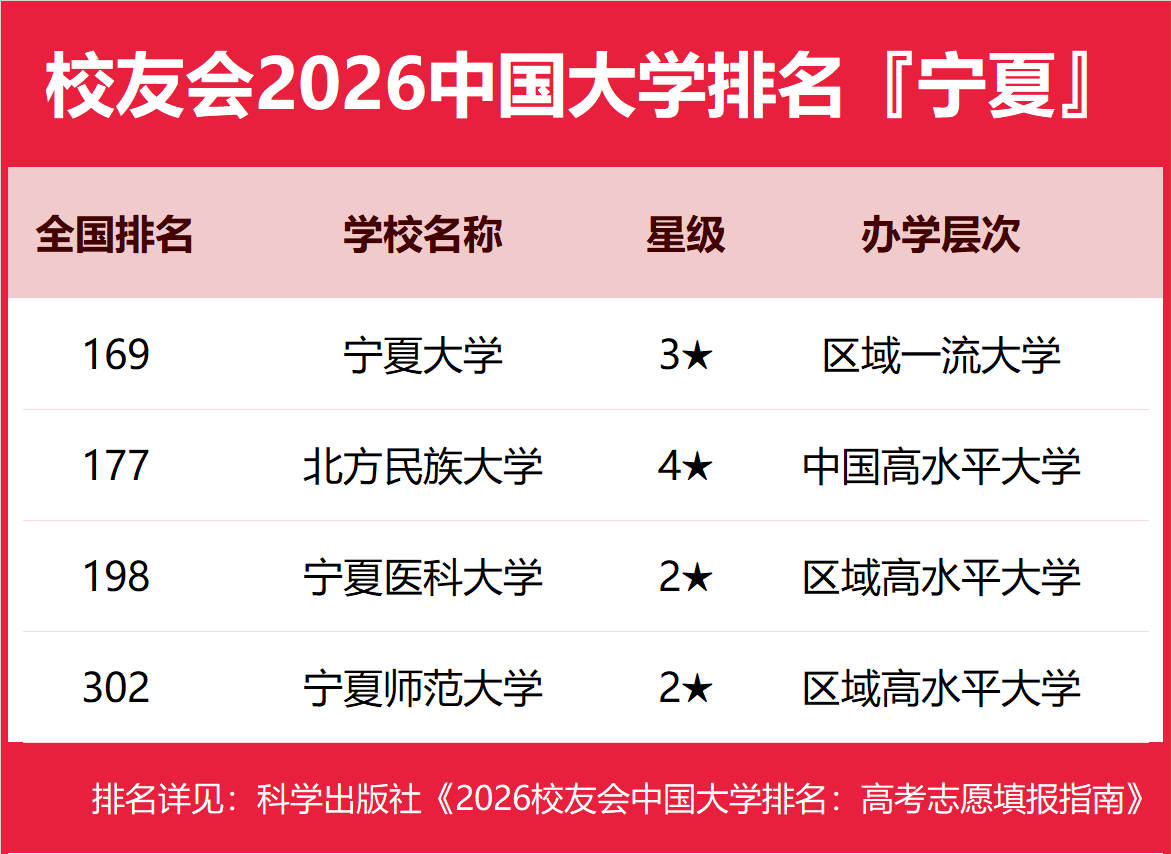 | 校友会2026年宁夏回族自治区大学排名,宁夏大学、宁夏理工学院、宁夏职业技术大学、宁夏财经职业技术学院第一 | |||