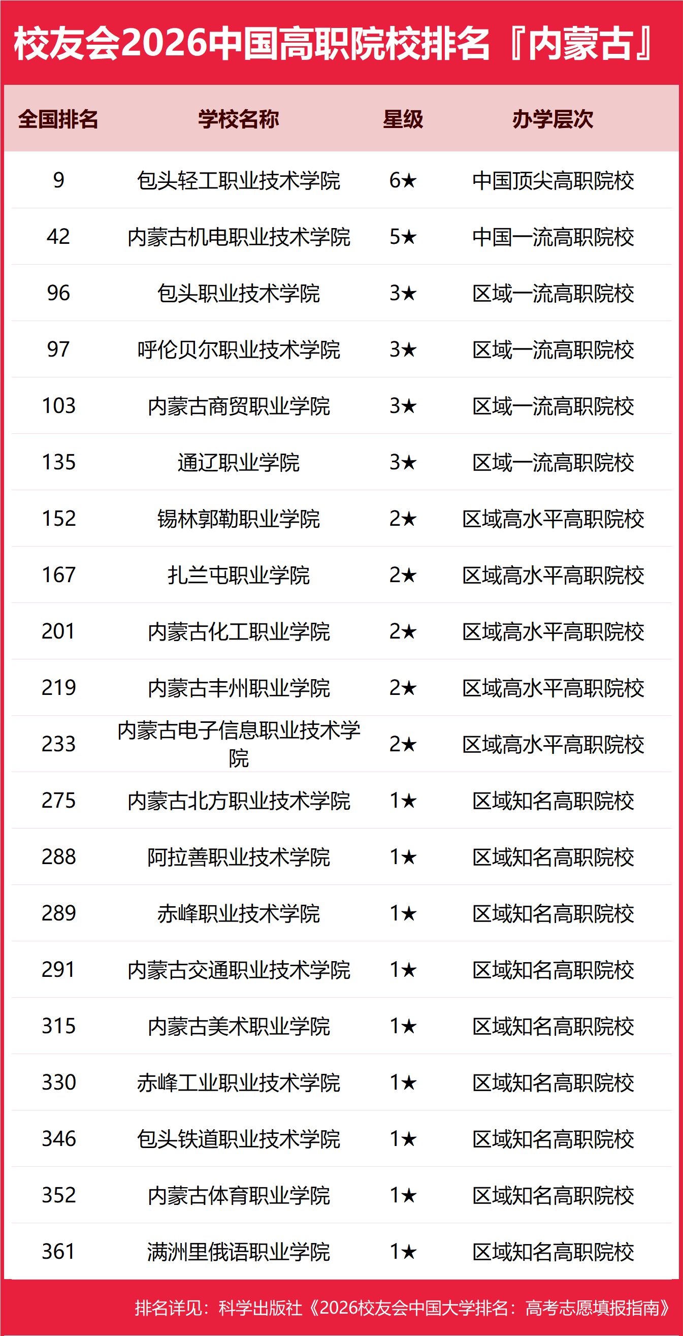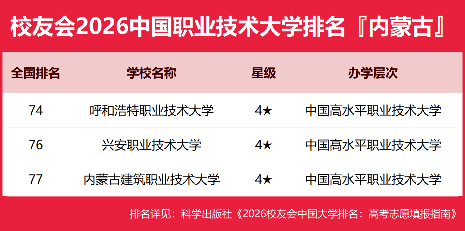 | 校友会2026年内蒙古自治区大学排名,内蒙古大学、内蒙古大学创业学院、呼和浩特职业技术大学、包头轻工职业技术学院第一 | |||