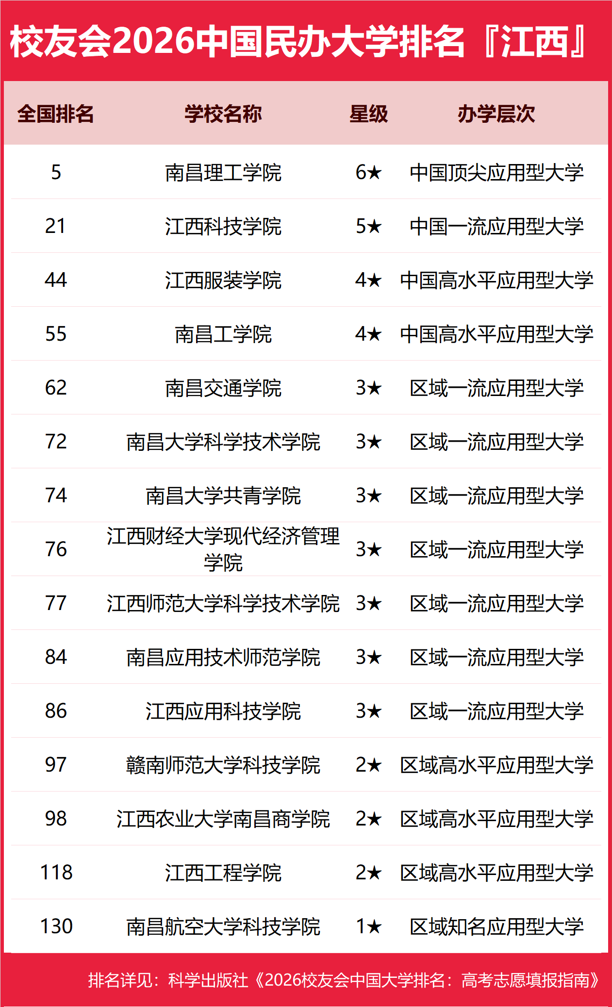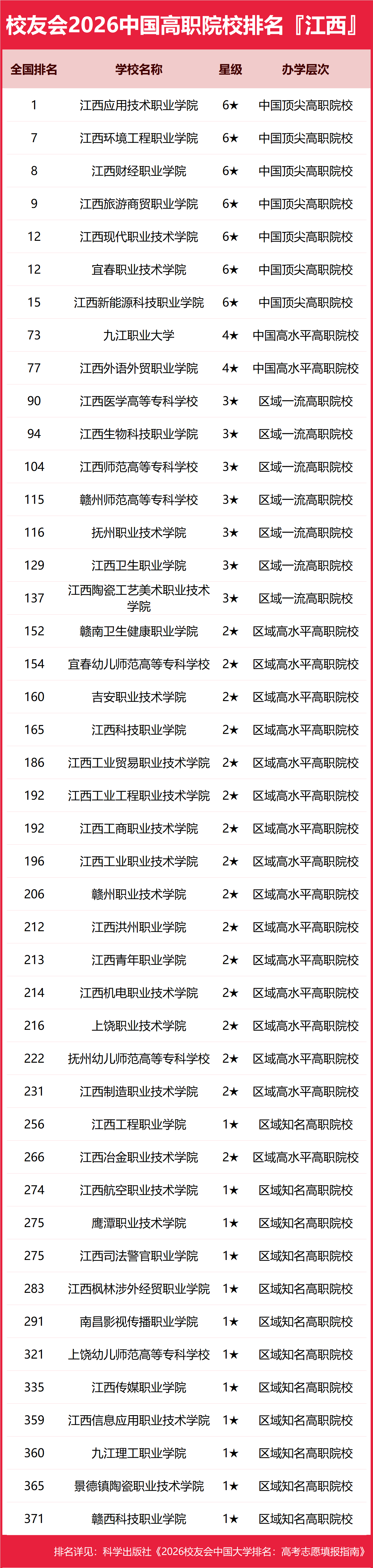 为了给2026年全国高考考生报考江西省高校提供参考指南,2026年1月12日,全国第三方大学评价机构艾瑞深校友会网(Cuaa.net)撰写完成、科学出版社即将出版的《2026校友会中国大学排名:高考志愿填报指南》最新发布校友会2026江西省大学排名。北京大学连续20年蝉联中国大学排名冠军,稳居霸主地位,问鼎2026中国大学排名榜首。清华大学第二,中国科学院大学和浙江大学并列第三,西湖大学、南方科技大学和上海科技大学挺进全国20强;福耀科技大学首次纳入中国大学排名,跻身全国50强。 科学出版社《2026校友会中国大学排名:高考志愿填报指南》 榜单显示,南昌大学问鼎校友会2026江西省大学排名首位,南昌理工学院位列2026江西省民办大学排名第一,江西职业技术大学位居2026江西省职业技术大学排名榜首,江西应用技术职业学院问鼎2026江西省高职院校排名冠军。 西交利物浦大学、宁波诺丁汉大学、香港中文大学(深圳)位列2026中国合作办学大学排名前三甲。武昌首义学院、三亚学院、西安欧亚学院、广州南方学院位列2026中国民办大学排名首位。深圳职业技术大学、海南科技职业大学、河北科技工程职业技术大学雄居2026中国职业技术大学排名前三甲。江西应用技术职业学院、合肥职业技术学院、浙江金融职业学院位列2026中国高职院校排名榜首。 校友会2026中国大学排名评价指标体系 南昌大学雄居2026江西省大学排名第一,江西理工大学、东华理工大学挺进前10强 在最新校友会2026中国大学排名中,中南财经政法大学全国排名第46名,雄居2026江西省大学排名第一。江西财经大学第2,江西师范大学第3。名列前10强的其他高校为江西理工大学、东华理工大学、江西农业大学、华东交通大学、南昌航空大学、景德镇陶瓷大学、赣南师范大学。 南昌理工学院雄居2026江西省民办大学排名第一,江西师范大学科学技术学院跻身前10强 在校友会2026中国民办大学排名中,南昌理工学院全国排名第5名,雄居2026江西省民办大学排名第一。江西科技学院第2,江西服装学院居第3。名列前10强的其他民办高校为南昌工学院、南昌交通学院、南昌大学科学技术学院、南昌大学共青学院、江西财经大学现代经济管理学院、江西师范大学科学技术学院、南昌应用技术师范学院。 江西职业技术大学雄居2026江西省职业技术大学排名第一,南昌科技职业大学、九江科技职业大学跻身前3强 在校友会2026中国职业技术大学排名中,江西职业技术大学全国排名第9名,雄居2026江西省职业技术大学排名第一。南昌科技职业大学列第2,九江科技职业大学居第3。名列前10强的其他职业技术大学为南昌职业大学、江西软件职业技术大学、景德镇艺术职业大学。 江西应用技术职业学院雄居2026江西省高职院校排名第一,江西新能源科技职业学院跻身前3强 在校友会2026中国高职院校排名中,江西应用技术职业学院全国排名第1名,雄居2026江西省高职院校排名第一。江西环境工程职业学院第2,江西财经职业学院第3。名列前10强的其他高职院校为江西旅游商贸职业学院、江西现代职业技术学院、宜春职业技术学院、江西新能源科技职业学院、九江职业大学、江西外语外贸职业学院、江西外语外贸职业学院、江西医学高等专科学校。 |