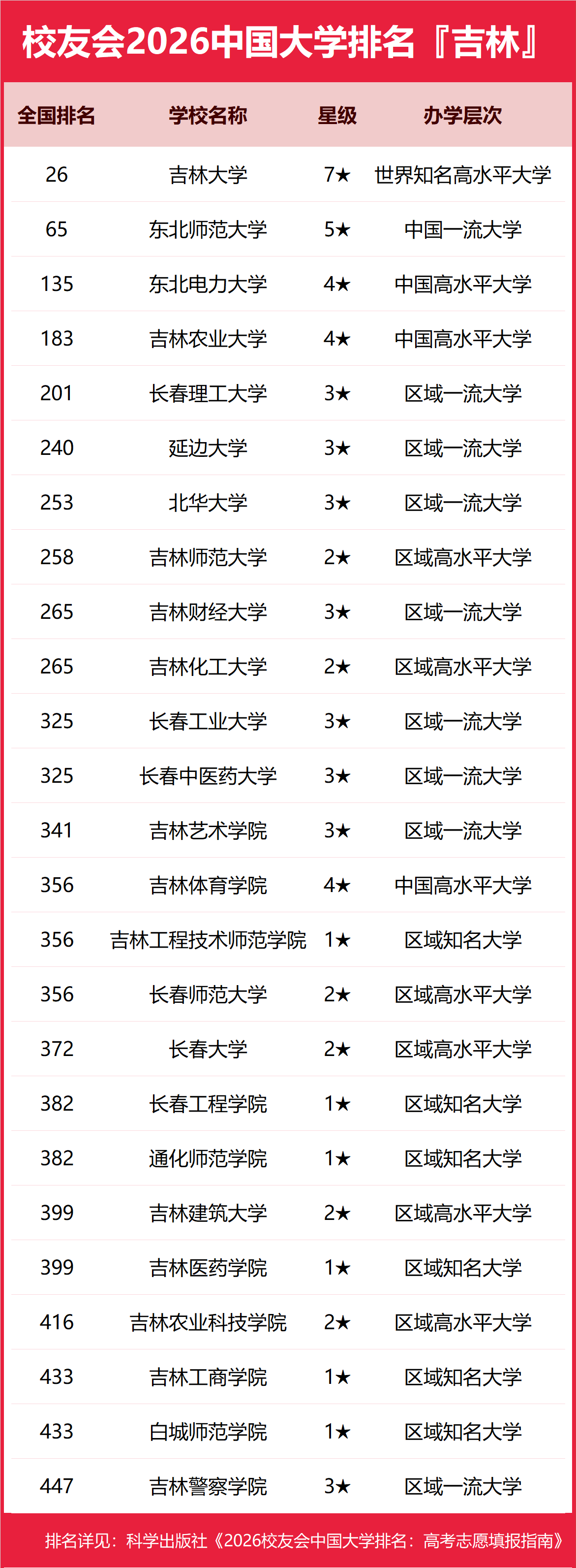 为了给2026年全国高考考生报考吉林省高校提供参考指南,2026年1月12日,全国第三方大学评价机构艾瑞深校友会网(Cuaa.net)撰写完成、科学出版社即将出版的《2026校友会中国大学排名:高考志愿填报指南》最新发布校友会2026吉林省大学排名。北京大学连续20年蝉联中国大学排名冠军,稳居霸主地位,问鼎2026中国大学排名榜首。清华大学第二,中国科学院大学和浙江大学并列第三,西湖大学、南方科技大学和上海科技大学挺进全国20强;福耀科技大学首次纳入中国大学排名,跻身全国50强。 科学出版社《2026校友会中国大学排名:高考志愿填报指南》 榜单显示,吉林大学问鼎校友会2026吉林省大学排名首位,长春财经学院位列2026吉林省民办大学排名第一,长春职业技术大学位居2026吉林省职业技术大学排名榜首,吉林交通职业技术学院问鼎2026吉林省高职院校排名冠军。 西交利物浦大学、宁波诺丁汉大学、香港中文大学(深圳)位列2026中国合作办学大学排名前三甲。武昌首义学院、三亚学院、西安欧亚学院、广州南方学院位列2026中国民办大学排名首位。深圳职业技术大学、海南科技职业大学、河北科技工程职业技术大学雄居2026中国职业技术大学排名前三甲。江西应用技术职业学院、合肥职业技术学院、浙江金融职业学院位列2026中国高职院校排名榜首。 校友会2026中国大学排名评价指标体系 吉林大学雄居2026吉林省大学排名第一,东北电力大学挺进前3强 在最新校友会2026中国大学排名中,吉林大学全国排名第26名,雄居2026吉林省大学排名第一。东北师范大学第2,东北电力大学第3。名列前10强的其他高校为吉林农业大学、长春理工大学、延边大学、北华大学、吉林师范大学、吉林财经大学、吉林化工大学。 长春财经学院雄居2026吉林省民办大学排名第一,吉林建筑科技学院跻身前3强 在校友会2026中国民办大学排名中,长春财经学院全国排名第5名,雄居2026吉林省民办大学排名第一。长春光华学院第2,吉林建筑科技学院居第3。名列前10强的其他民办高校为长春建筑学院、长春电子科技学院、吉林外国语大学、长春科技学院、吉林动画学院、长春人文学院、长春大学旅游学院。 长春职业技术大学雄居2026吉林省职业技术大学排名第一,吉林铁道职业技术大学院跻身前3强 在校友会2026中国职业技术大学排名中,长春职业技术大学全国排名第34名,雄居2026吉林省职业技术大学排名第一。长春汽车职业技术大学列第2,吉林铁道职业技术大学居第3。 吉林交通职业技术学院雄居2026吉林省高职院校排名第一,白城医学高等专科学校跻身前3强 在校友会2026中国高职院校排名中,吉林交通职业技术学院全国排名第40名,雄居2026吉林省高职院校排名第一。白城医学高等专科学校第2,长白山职业技术学院第3。名列前10强的其他高职院校为吉林电子信息职业技术学院、长春医学高等专科学校、吉林城市职业技术学院、吉林工业职业技术学院、吉林职业技术学院、长春信息技术职业学院、吉林工程职业学院。 |
