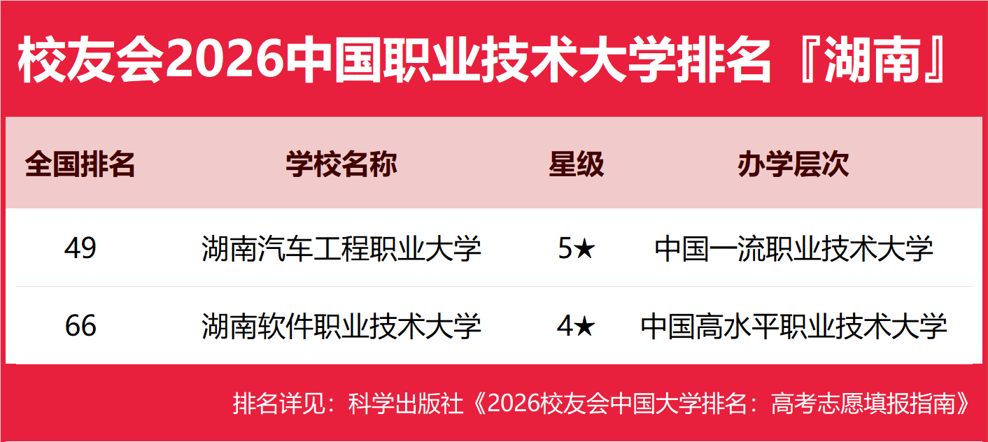 为了给2026年全国高考考生报考湖南省高校提供参考指南,2026年1月12日,全国第三方大学评价机构艾瑞深校友会网(Cuaa.net)撰写完成、科学出版社即将出版的《2026校友会中国大学排名:高考志愿填报指南》最新发布校友会2026湖南省大学排名。北京大学连续20年蝉联中国大学排名冠军,稳居霸主地位,问鼎2026中国大学排名榜首。清华大学第二,中国科学院大学和浙江大学并列第三,西湖大学、南方科技大学和上海科技大学挺进全国20强;福耀科技大学首次纳入中国大学排名,跻身全国50强。 科学出版社《2026校友会中国大学排名:高考志愿填报指南》 榜单显示,国防科技大学问鼎校友会2026湖南省大学排名首位,湖南信息学院位列2026湖南省民办大学排名第一,湖南汽车工程职业大学位居2026湖南省职业技术大学排名榜首,永州职业技术学院问鼎2026湖南省高职院校排名冠军。 西交利物浦大学、宁波诺丁汉大学、香港中文大学(深圳)位列2026中国合作办学大学排名前三甲。武昌首义学院、三亚学院、西安欧亚学院、广州南方学院位列2026中国民办大学排名首位。深圳职业技术大学、海南科技职业大学、河北科技工程职业技术大学雄居2026中国职业技术大学排名前三甲。江西应用技术职业学院、合肥职业技术学院、浙江金融职业学院位列2026中国高职院校排名榜首。 校友会2026中国大学排名评价指标体系 国防科技大学雄居2026湖南省大学排名第一,湘潭大学、南华大学挺进前10强 在最新校友会2026中国大学排名中,国防科技大学全国排名第13名,雄居2026湖南省大学排名第一。中南大学第2,湖南大学第3。名列前10强的其他高校为湖南师范大学、湘潭大学、湖南农业大学、长沙理工大学、南华大学、中南林业科技大学、吉首大学。 湖南信息学院雄居2026湖南省民办大学排名第一,湘潭理工学院跻身前10强 在校友会2026中国民办大学排名中,湖南信息学院全国排名第8名,雄居2026湖南省民办大学排名第一。长沙医学院第2,湖南涉外经济学院居第3。名列前10强的其他民办高校为湘潭理工学院、岳阳学院、长沙科技学院、湖南农业大学东方科技学院、中南林业科技大学涉外学院、常德学院、湘潭大学兴湘学院、张家界学院。 湖南汽车工程职业大学雄居2026湖南省职业技术大学排名第一,湖南软件职业技术大学院跻身前3强 在校友会2026中国职业技术大学排名中,湖南汽车工程职业大学全国排名第49名,雄居2026湖南省职业技术大学排名第一。湖南软件职业技术大学列第2。 永州职业技术学院雄居2026湖南省高职院校排名第一,长沙民政职业技术学院跻身前3强 在校友会2026中国高职院校排名中,永州职业技术学院全国排名第13名,雄居2026湖南省高职院校排名第一。娄底职业技术学院第2,长沙民政职业技术学院第3。名列前10强的其他高职院校为湖南环境生物职业技术学院、湖南民族职业学院、湖南铁道职业技术学院、岳阳职业技术学院、湖南都市职业学院、湖南生物机电职业技术学院、湘西民族职业技术学院。 |