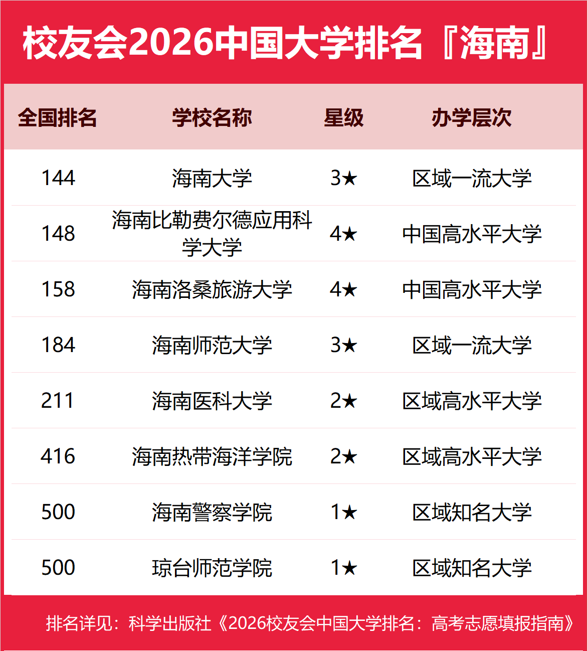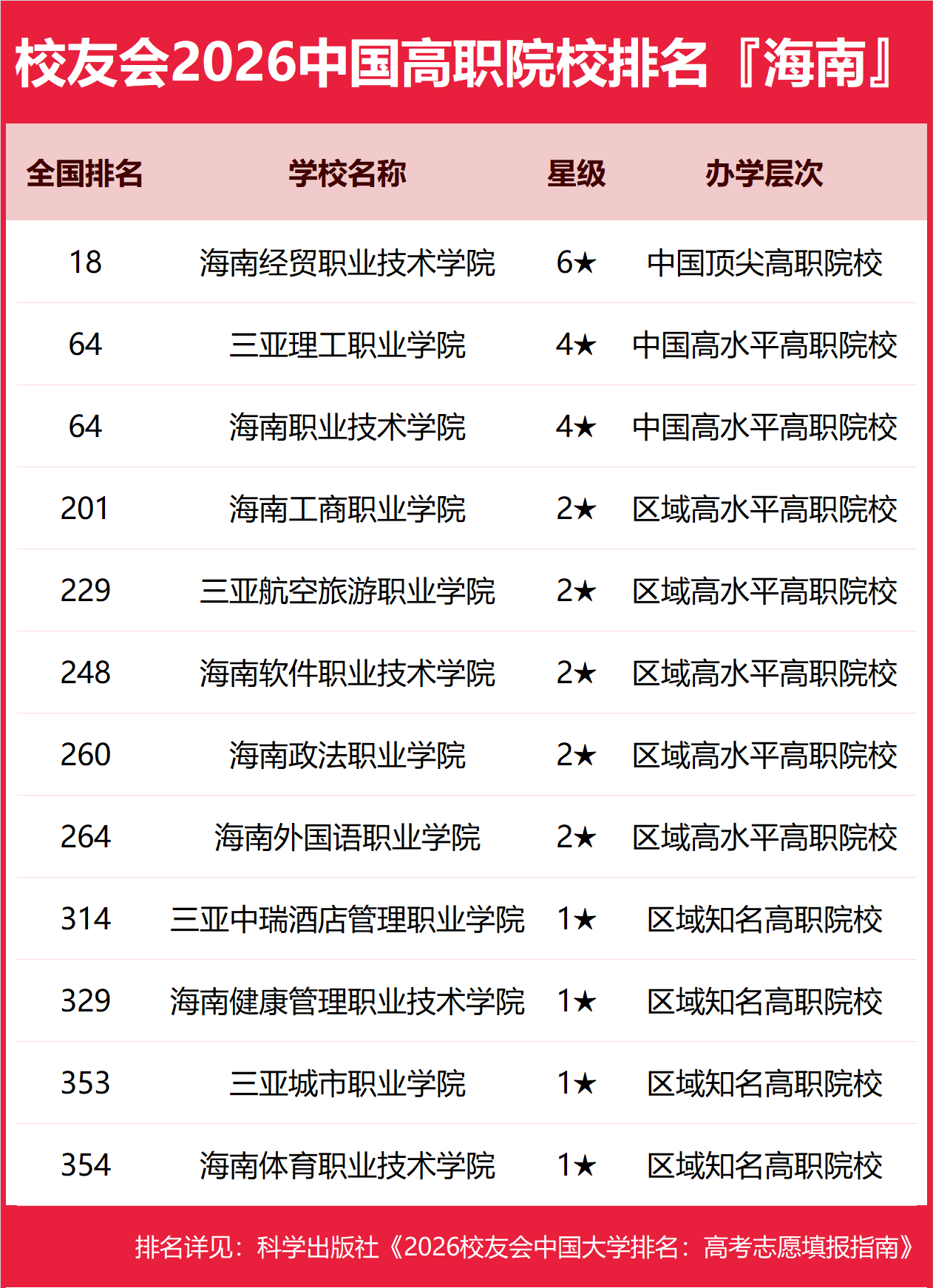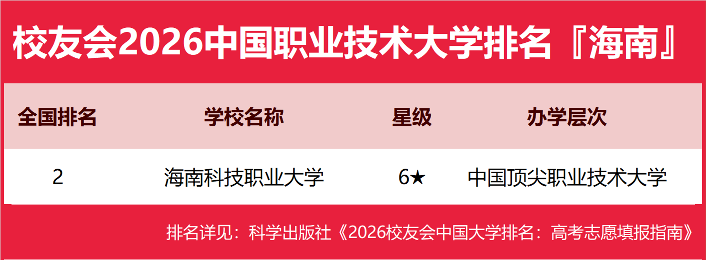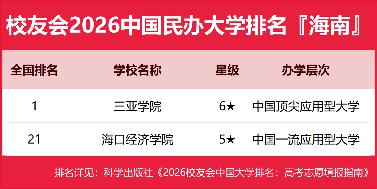 为了给2026年全国高考考生报考海南省高校提供参考指南,2026年1月12日,全国第三方大学评价机构艾瑞深校友会网(Cuaa.net)撰写完成、科学出版社即将出版的《2026校友会中国大学排名:高考志愿填报指南》最新发布校友会2026海南省大学排名。北京大学连续20年蝉联中国大学排名冠军,稳居霸主地位,问鼎2026中国大学排名榜首。清华大学第二,中国科学院大学和浙江大学并列第三,西湖大学、南方科技大学和上海科技大学挺进全国20强;福耀科技大学首次纳入中国大学排名,跻身全国50强。 科学出版社《2026校友会中国大学排名:高考志愿填报指南》 榜单显示,海南大学问鼎校友会2026海南省大学排名首位,三亚学院位列2026海南省民办大学排名第一,海南科技职业大学位居2026海南省职业技术大学排名榜首,海南经贸职业技术学院问鼎2026海南省高职院校排名冠军。 西交利物浦大学、宁波诺丁汉大学、香港中文大学(深圳)位列2026中国合作办学大学排名前三甲。武昌首义学院、三亚学院、西安欧亚学院、广州南方学院位列2026中国民办大学排名首位。深圳职业技术大学、海南科技职业大学、河北科技工程职业技术大学雄居2026中国职业技术大学排名前三甲。江西应用技术职业学院、合肥职业技术学院、浙江金融职业学院位列2026中国高职院校排名榜首。 校友会2026中国大学排名评价指标体系 海南大学雄居2026海南省大学排名第一,海南洛桑旅游大学挺进前3强 在最新校友会2026中国大学排名中,海南大学全国排名第144名,雄居2026海南省大学排名第一。海南比勒费尔德应用科学大学第2,海南洛桑旅游大学第3。名列前10强的其他高校为海南师范大学、海南医科大学、海南热带海洋学院、海南警察学院、琼台师范学院。 三亚学院雄居2026海南省民办大学排名第一,海口经济学院第2 在校友会2026中国民办大学排名中,三亚学院全国排名第1名,雄居2026海南省民办大学排名第一。海口经济学院第2。 海南科技职业大学雄居2026海南省职业技术大学排名第一 在校友会2026中国职业技术大学排名中,海南科技职业大学全国排名第2名。 海南经贸职业技术学院雄居2026海南省高职院校排名第一,三亚理工职业学院跻身前3强 在校友会2026中国高职院校排名中,海南经贸职业技术学院全国排名第18名,雄居2026海南省高职院校排名第一。三亚理工职业学院、海南职业技术学院并列第2。名列前10强的其他高职院校为海南工商职业学院、三亚航空旅游职业学院、海南软件职业技术学院、海南政法职业学院、海南外国语职业学院、三亚中瑞酒店管理职业学院、海南健康管理职业技术学院。 |