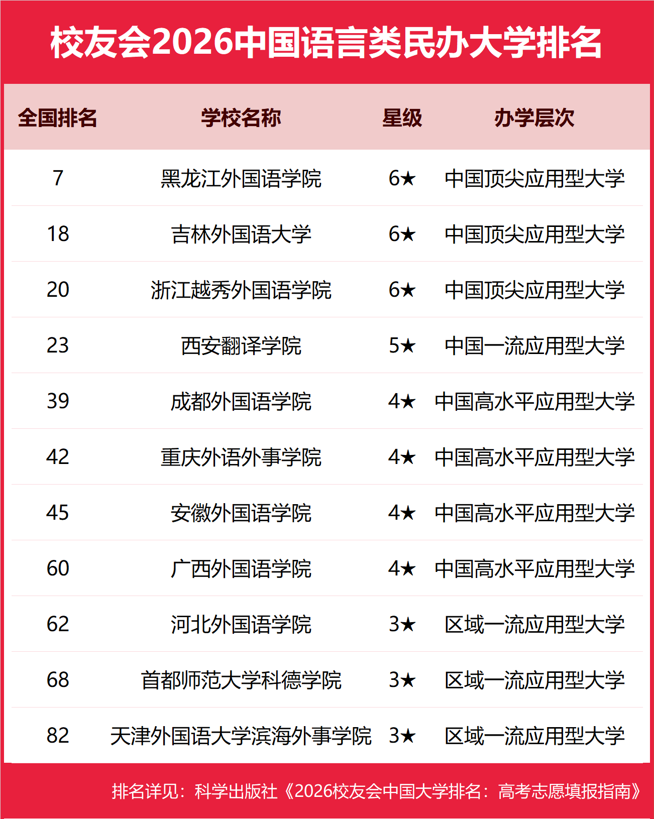 为了给2026年全国高考考生报考中国语言类高校提供参考指南,2026年1月12日,全国第三方大学评价机构艾瑞深校友会网(Cuaa.net)撰写完成、科学出版社即将出版的《2026校友会中国大学排名:高考志愿填报指南》最新发布校友会2026中国语言类大学排名。北京大学连续20年蝉联中国大学排名冠军,稳居霸主地位,问鼎2026中国大学排名榜首。清华大学第二,中国科学院大学和浙江大学并列第三,西湖大学、南方科技大学和上海科技大学挺进全国20强;福耀科技大学首次纳入中国大学排名,跻身全国50强。 科学出版社《2026校友会中国大学排名:高考志愿填报指南》 榜单显示,中国传媒大学问鼎校友会2026中国语言类大学排名首位,黑龙江外国语学院位列2026中国语言类民办大学排名第一,山东外国语职业技术大学位居2026中国语言类职业技术大学排名榜首,武汉外语外事职业学院问鼎2026中国语言类高职院校排名冠军。 西交利物浦大学、宁波诺丁汉大学、香港中文大学(深圳)位列2026中国合作办学大学排名前三甲。武昌首义学院、三亚学院、西安欧亚学院、广州南方学院位列2026中国民办大学排名首位。深圳职业技术大学、海南科技职业大学、河北科技工程职业技术大学雄居2026中国职业技术大学排名前三甲。江西应用技术职业学院、合肥职业技术学院、浙江金融职业学院位列2026中国高职院校排名榜首。 校友会2026中国大学排名评价指标体系 中国传媒大学雄居2026中国语言类大学排名第一,上海外国语大学挺进前10强 在最新校友会2026中国大学排名中,中国传媒大学全国排名第70名,雄居2026中国语言类大学排名第一。北京外国语大学第2,北京语言大学第3。名列前10强的其他高校为上海外国语大学、外交学院、广东外语外贸大学、北京第二外国语学院、大连外国语大学、天津外国语大学、四川外国语大学、西安外国语大学。 黑龙江外国语学院雄居2026中国语言类民办大学排名第一,西安翻译学院跻身前10强 在校友会2026中国民办大学排名中,黑龙江外国语学院全国排名第7名,雄居2026中国语言类民办大学排名第一。吉林外国语大学第2,浙江越秀外国语学院居第3。名列前10强的其他民办高校为西安翻译学院、成都外国语学院、重庆外语外事学院、安徽外国语学院、广西外国语学院、河北外国语学院、首都师范大学科德学院。 山东外国语职业技术大学雄居2026中国语言类职业技术大学排名第一。 在校友会2026中国职业技术大学排名中,山东外国语职业技术大学全国排名第42名,雄居2026中国语言类职业技术大学排名第一。 武汉外语外事职业学院雄居2026中国语言类高职院校排名第一,河北女子职业技术学院跻身前3强 在校友会2026中国高职院校排名中,武汉外语外事职业学院全国排名第40名,雄居2026中国语言类高职院校排名第一。河北对外经贸职业学院第2,河北女子职业技术学院第3。名列前10强的其他高职院校为湖南外国语职业学院、大连翻译职业学院、上海工商外国语职业学院、云南外事外语职业学院、兰州外语职业学院、重庆传媒职业学院、海南外国语职业学院。 |
