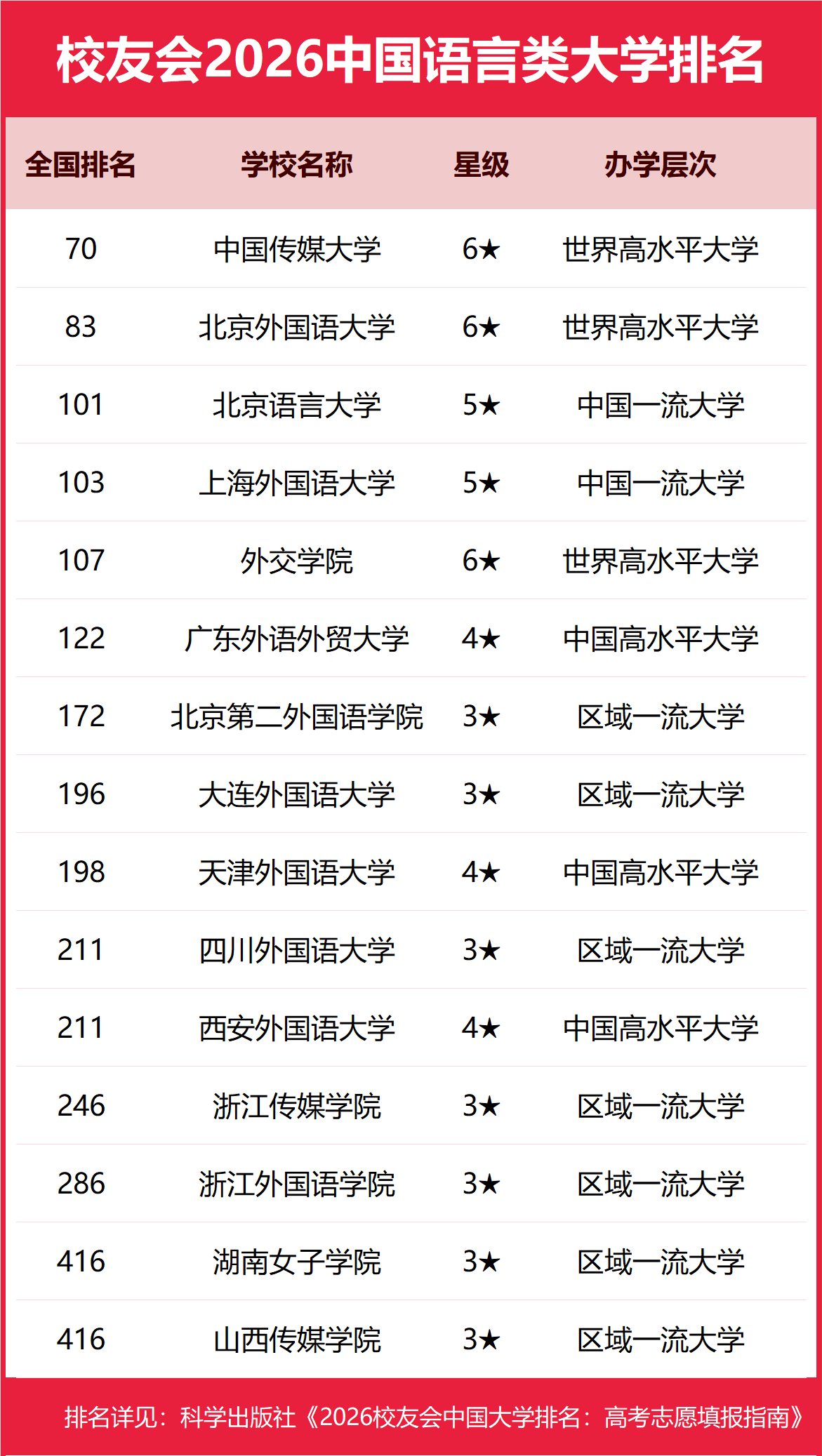 | 校友会2026年中国语言类大学排名,中国传媒大学、黑龙江外国语学院、山东外国语职业技术大学、武汉外语外事职院第一 | |||