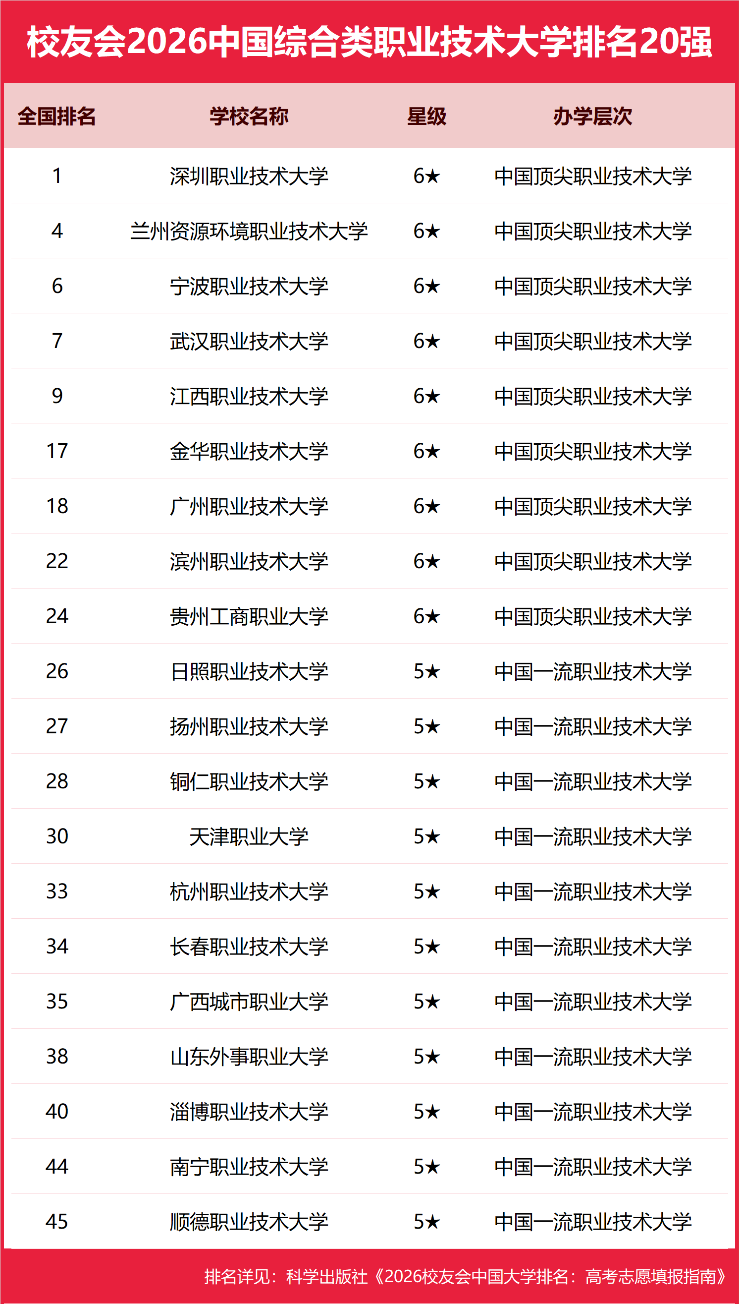 为了给2026年全国高考考生报考中国综合类高校提供参考指南,2026年1月12日,全国第三方大学评价机构艾瑞深校友会网(Cuaa.net)撰写完成、科学出版社即将出版的《2026校友会中国大学排名:高考志愿填报指南》最新发布校友会2026中国综合类大学排名。北京大学连续20年蝉联中国大学排名冠军,稳居霸主地位,问鼎2026中国大学排名榜首。清华大学第二,中国科学院大学和浙江大学并列第三,西湖大学、南方科技大学和上海科技大学挺进全国20强;福耀科技大学首次纳入中国大学排名,跻身全国50强。 科学出版社《2026校友会中国大学排名:高考志愿填报指南》 榜单显示,北京大学问鼎校友会2026中国综合类大学排名首位,三亚学院、广州南方学院位列2026中国综合类民办大学排名并列第一,深圳职业技术大学位居2026中国综合类职业技术大学排名榜首,合肥职业技术学院问鼎2026中国综合类高职院校排名冠军。 西交利物浦大学、宁波诺丁汉大学、香港中文大学(深圳)位列2026中国合作办学大学排名前三甲。武昌首义学院、三亚学院、西安欧亚学院、广州南方学院位列2026中国民办大学排名首位。深圳职业技术大学、海南科技职业大学、河北科技工程职业技术大学雄居2026中国职业技术大学排名前三甲。江西应用技术职业学院、合肥职业技术学院、浙江金融职业学院位列2026中国高职院校排名榜首。 校友会2026中国大学排名评价指标体系 北京大学雄居2026中国综合类大学排名第一,浙江大学、武汉大学挺进前10强 在最新校友会2026中国大学排名中,北京大学全国排名第1名,雄居2026中国综合类大学排名第一。清华大学第2,浙江大学第3。名列前10强的其他高校为复旦大学、上海交通大学、南京大学、南开大学、中国社会科学院大学、武汉大学、华中科技大学。 三亚学院、广州南方学院并列2026中国综合类民办大学排名第一,西安培华学院跻身前5强 在校友会2026中国民办大学排名中,三亚学院、广州南方学院全国排名并列第1名,雄居2026中国综合类民办大学排名并列第一。昆明城市学院居第3。名列前10强的其他民办高校为四川大学锦江学院、西安培华学院、天津仁爱学院、沈阳城市学院、商丘学院、广东科技学院、湖南信息学院、长春光华学院。 深圳职业技术大学雄居2026中国综合类职业技术大学排名第一,兰州资源环境职业技术大学院跻身前3强 在校友会2026中国职业技术大学排名中,深圳职业技术大学全国排名第1名,雄居2026中国综合类职业技术大学排名第一。兰州资源环境职业技术大学列第2,宁波职业技术大学居第3。名列前10强的其他职业技术大学为武汉职业技术大学、江西职业技术大学、金华职业技术大学、广州职业技术大学、滨州职业技术大学、贵州工商职业大学、日照职业技术大学、扬州职业技术大学。 合肥职业技术学院雄居2026中国综合类高职院校排名第一,襄阳职业技术学院跻身前3强 在校友会2026中国高职院校排名中,合肥职业技术学院全国排名第1名,雄居2026中国综合类高职院校排名第一。襄阳职业技术学院第2,商丘职业技术学院第3。名列前10强的其他高职院校为天津轻工职业技术学院、天津轻工职业技术学院、烟台职业学院、重庆工商职业学院、潍坊职业学院、威海职业学院、湖北职业技术学院。 |