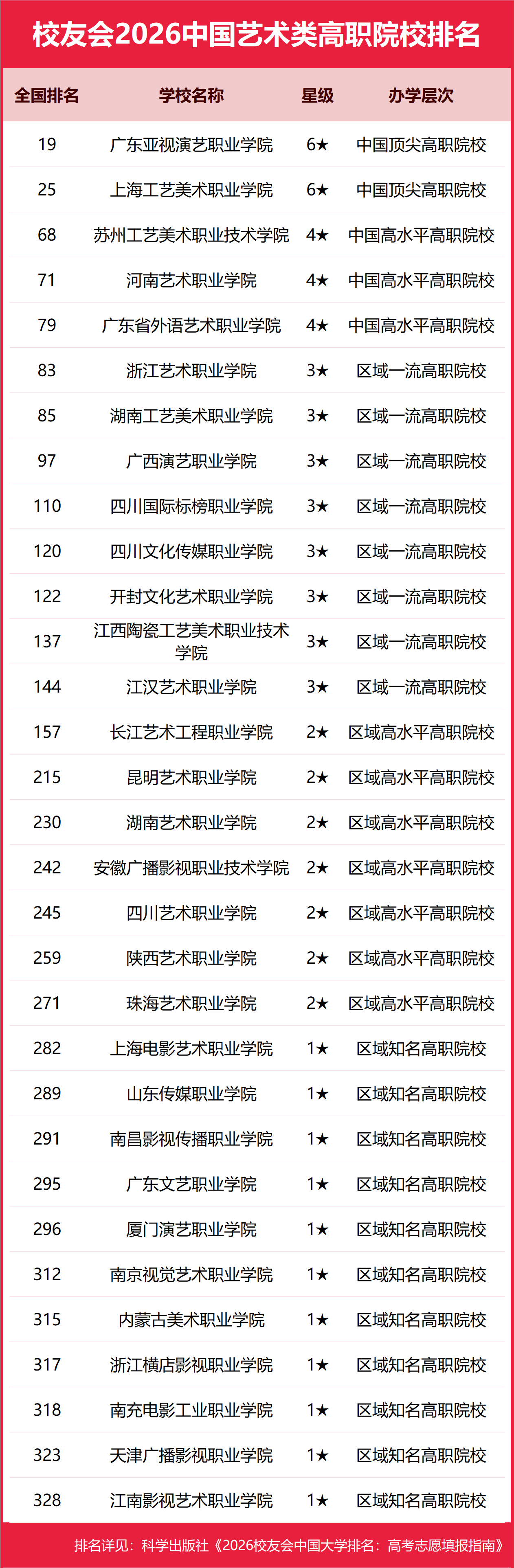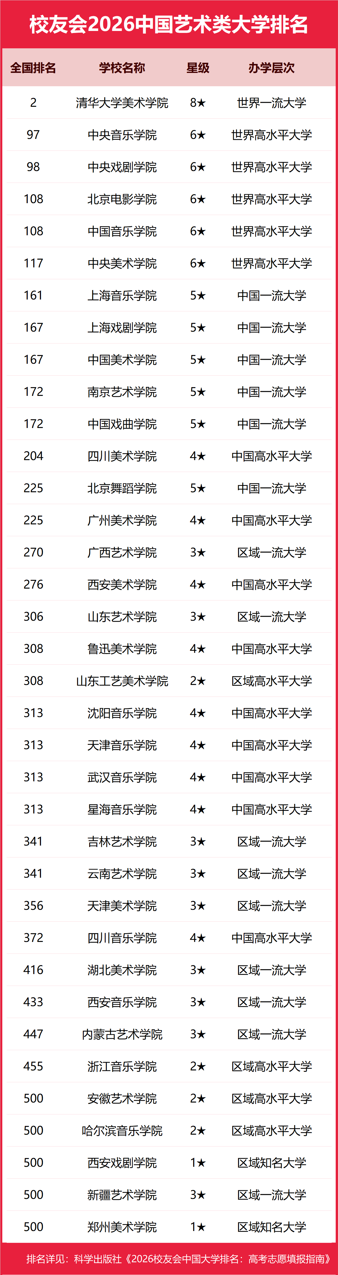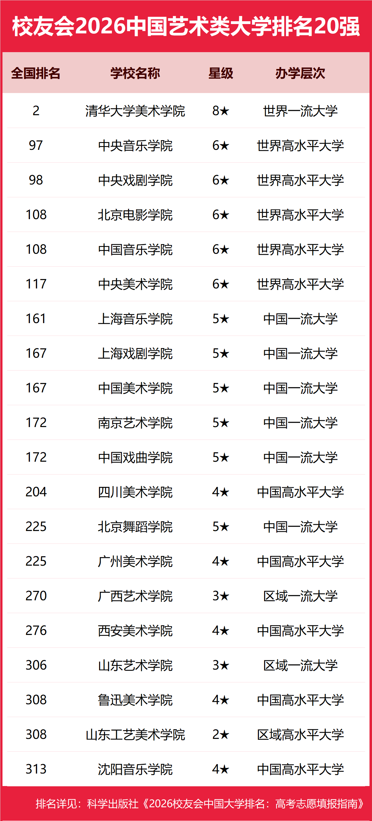 为了给2026年全国高考考生报考中国艺术类高校提供参考指南,2026年1月12日,全国第三方大学评价机构艾瑞深校友会网(Cuaa.net)撰写完成、科学出版社即将出版的《2026校友会中国大学排名:高考志愿填报指南》最新发布校友会2026中国艺术类大学排名。北京大学连续20年蝉联中国大学排名冠军,稳居霸主地位,问鼎2026中国大学排名榜首。清华大学第二,中国科学院大学和浙江大学并列第三,西湖大学、南方科技大学和上海科技大学挺进全国20强;福耀科技大学首次纳入中国大学排名,跻身全国50强。 科学出版社《2026校友会中国大学排名:高考志愿填报指南》 榜单显示,清华大学美术学院问鼎校友会2026中国艺术类大学排名首位,辽宁传媒学院位列2026中国艺术类民办大学排名第一,景德镇艺术职业大学位居2026中国艺术类职业技术大学排名榜首,广东亚视演艺职业学院问鼎2026中国艺术类高职院校排名冠军。 西交利物浦大学、宁波诺丁汉大学、香港中文大学(深圳)位列2026中国合作办学大学排名前三甲。武昌首义学院、三亚学院、西安欧亚学院、广州南方学院位列2026中国民办大学排名首位。深圳职业技术大学、海南科技职业大学、河北科技工程职业技术大学雄居2026中国职业技术大学排名前三甲。江西应用技术职业学院、合肥职业技术学院、浙江金融职业学院位列2026中国高职院校排名榜首。 校友会2026中国大学排名评价指标体系 清华大学美术学院雄居2026中国艺术类大学排名第一,中央戏剧学院挺进前10强 在最新校友会2026中国大学排名中,清华大学美术学院全国排名第2名,雄居2026中国艺术类大学排名第一。中央音乐学院第2,中央戏剧学院第3。名列前10强的其他高校为北京电影学院、中国音乐学院、中央美术学院、上海音乐学院、上海戏剧学院、中国美术学院、南京艺术学院、中国戏曲学院。 辽宁传媒学院雄居2026中国艺术类民办大学排名第一,南京传媒学院跻身前10强 在校友会2026中国民办大学排名中,辽宁传媒学院全国排名第10名,雄居2026中国艺术类民办大学排名第一。上海视觉艺术学院第2,河北传媒学院居第3。名列前10强的其他民办高校为南京传媒学院、大连艺术学院、四川传媒学院、武汉传媒学院、青岛电影学院、河北美术学院、江西服装学院。 景德镇艺术职业大学雄居2026中国艺术类职业技术大学排名第一,山西文化旅游职业大学跻身前3强 在校友会2026中国职业技术大学排名中,景德镇艺术职业大学全国排名第84名,雄居2026中国艺术类高职业技术大学排名第一。成都艺术职业大学、山西文化旅游职业大学并列第2。 广东亚视演艺职业学院雄居2026中国艺术类高职院校排名第一,上海工艺美术职业学院跻身前3强 在校友会2026中国高职院校排名中,广东亚视演艺职业学院全国排名第19名,雄居2026中国艺术类高职院校排名第一。上海工艺美术职业学院第2,苏州工艺美术职业技术学院第3。名列前10强的其他高职院校为河南艺术职业学院、广东省外语艺术职业学院、浙江艺术职业学院、湖南工艺美术职业学院、广西演艺职业学院、四川国际标榜职业学院、四川文化传媒职业学院。 |