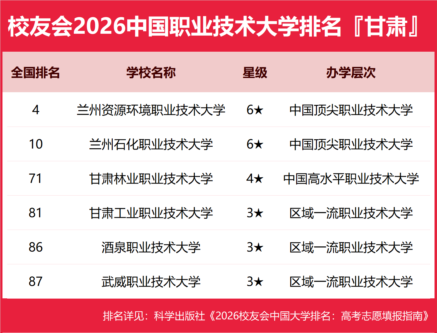 | 校友会2026年甘肃省大学排名,兰州大学、兰州工商学院、兰州资源环境职业技术大学、平凉职业技术学院第一 | |||