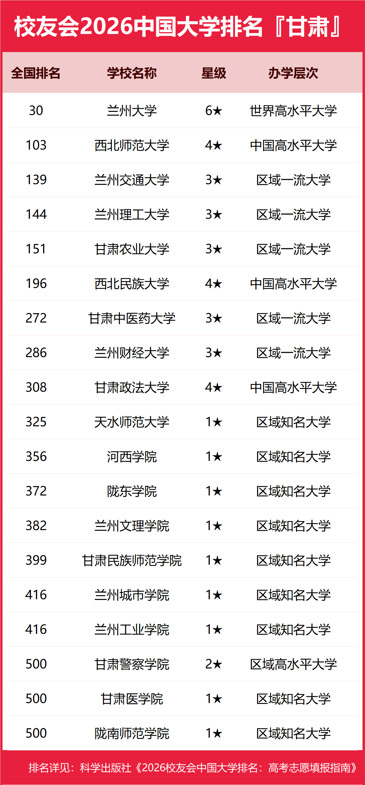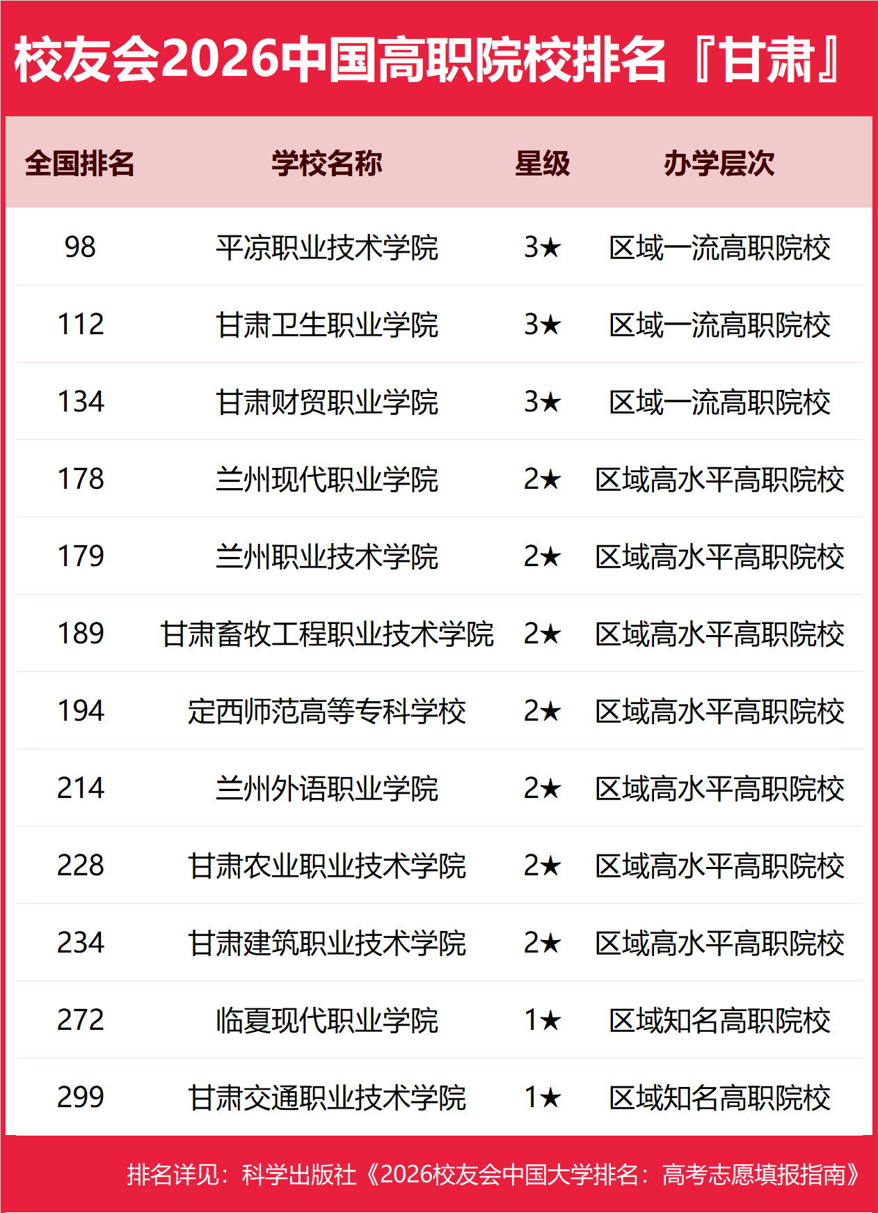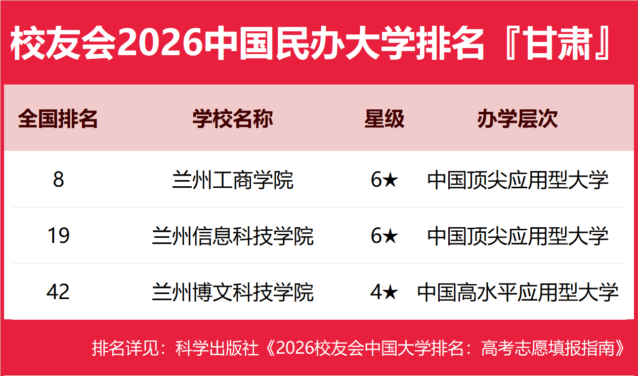 为了给2026年全国高考考生报考甘肃省高校提供参考指南,2026年1月12日,全国第三方大学评价机构艾瑞深校友会网(Cuaa.net)撰写完成、科学出版社即将出版的《2026校友会中国大学排名:高考志愿填报指南》最新发布校友会2026甘肃省大学排名。北京大学连续20年蝉联中国大学排名冠军,稳居霸主地位,问鼎2026中国大学排名榜首。清华大学第二,中国科学院大学和浙江大学并列第三,西湖大学、南方科技大学和上海科技大学挺进全国20强;福耀科技大学首次纳入中国大学排名,跻身全国50强。 科学出版社《2026校友会中国大学排名:高考志愿填报指南》 榜单显示,兰州大学问鼎校友会2026甘肃省大学排名首位,兰州工商学院位列2026甘肃省民办大学排名第一,兰州资源环境职业技术大学位居2026甘肃省职业技术大学排名榜首,平凉职业技术学院问鼎2026甘肃省高职院校排名冠军。 西交利物浦大学、宁波诺丁汉大学、香港中文大学(深圳)位列2026中国合作办学大学排名前三甲。武昌首义学院、三亚学院、西安欧亚学院、广州南方学院位列2026中国民办大学排名首位。深圳职业技术大学、海南科技职业大学、河北科技工程职业技术大学雄居2026中国职业技术大学排名前三甲。江西应用技术职业学院、合肥职业技术学院、浙江金融职业学院位列2026中国高职院校排名榜首。 校友会2026中国大学排名评价指标体系 兰州大学雄居2026甘肃省大学排名第一,兰州交通大学挺进前3强 在最新校友会2026中国大学排名中,兰州大学全国排名第30名,雄居2026甘肃省大学排名第一。西北师范大学第2,兰州交通大学第3。名列前10强的其他高校为兰州理工大学、甘肃农业大学、西北民族大学、甘肃中医药大学、兰州财经大学、甘肃政法大学、天水师范大学。 兰州工商学院雄居2026甘肃省民办大学排名第一,兰州信息科技学院第2 在校友会2026中国民办大学排名中,兰州工商学院全国排名第8名,雄居2026甘肃省民办大学排名第一。兰州信息科技学院第2,兰州博文科技学院居第3。 兰州资源环境职业技术大学雄居2026甘肃省职业技术大学排名第一,甘肃林业职业技术大学跻身前3强 在校友会2026中国职业技术大学排名中,兰州资源环境职业技术大全国排名第4名,雄居2026甘肃省职业技术大学排名第一。兰州石化职业技术大学列第2,甘肃林业职业技术大学居第3。名列前10强的其他职业技术大学为甘肃工业职业技术大学、酒泉职业技术大学、武威职业技术大学。 平凉职业技术学院雄居2026甘肃省高职院校排名第一,甘肃卫生职业学院跻身前3强 在校友会2026中国高职院校排名中,平凉职业技术学院全国排名第98名,雄居2026甘肃省高职院校排名第一。甘肃卫生职业学院第2,甘肃财贸职业学院第3。名列前10强的其他高职院校为兰州现代职业学院、兰州职业技术学院、甘肃畜牧工程职业技术学院、定西师范高等专科学校、兰州外语职业学院、甘肃农业职业技术学院、甘肃农业职业技术学院、甘肃建筑职业技术学院。 |