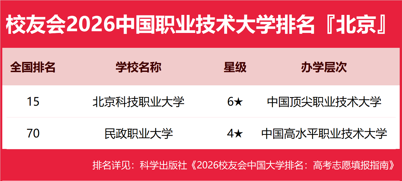 | 校友会2026年北京市大学排名,北京大学、北京城市学院、北京科技职业大学、北京工业职业技术学院第一 | |||
