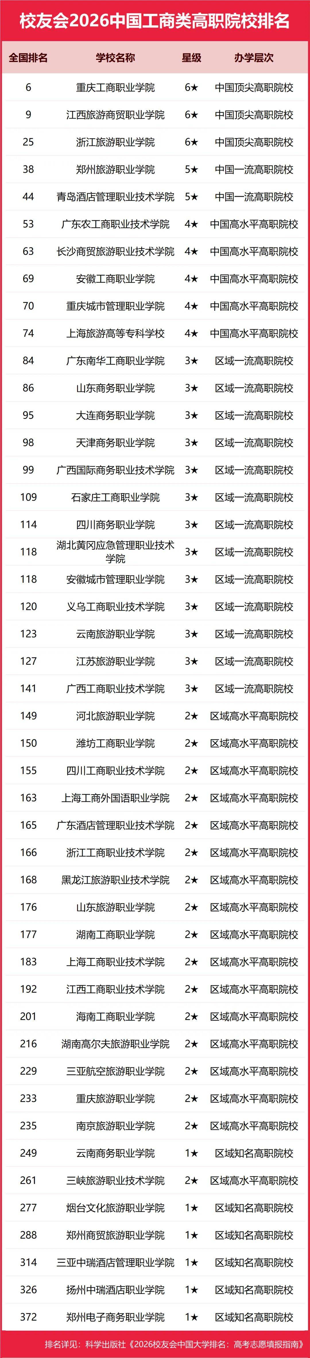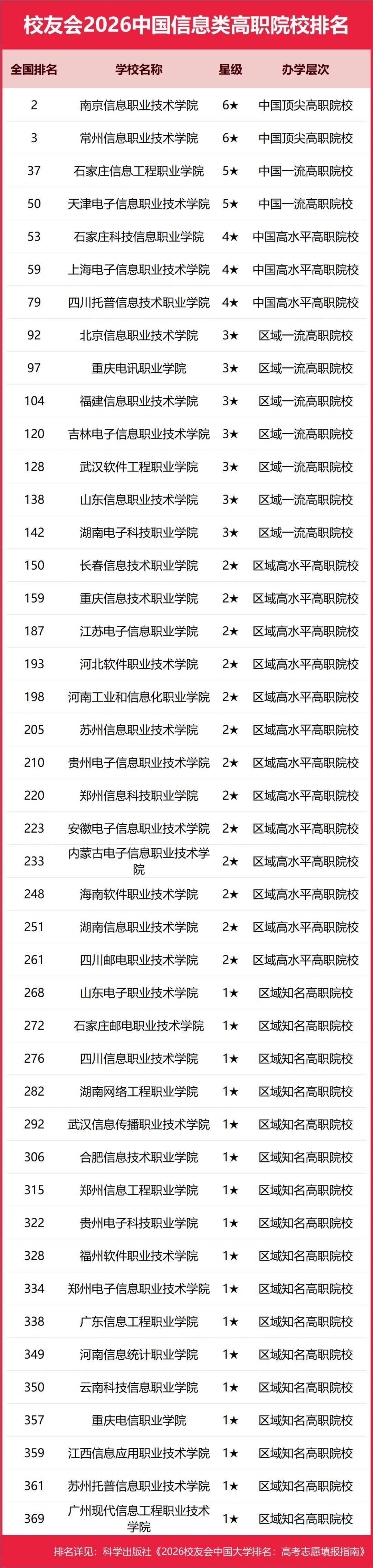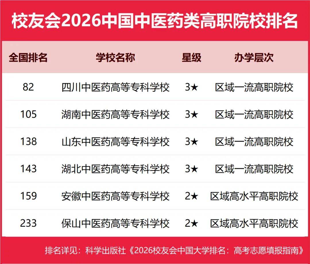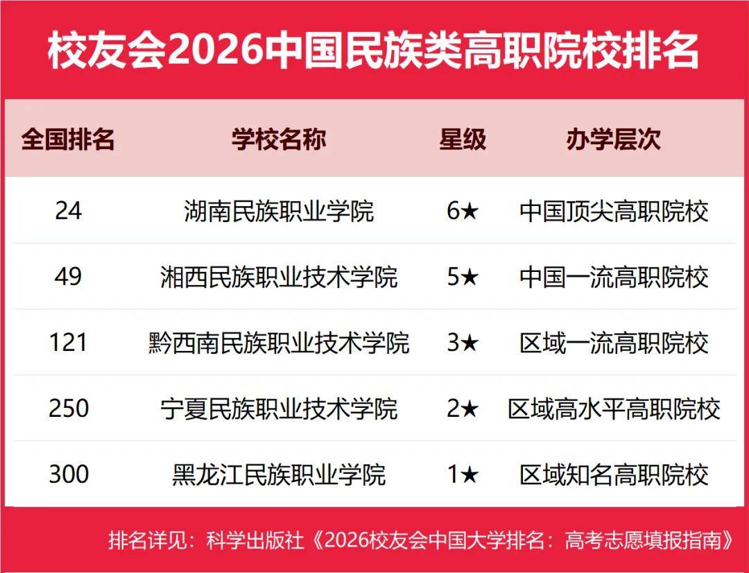2026年1月12日,全国第三方大学评价机构艾瑞深校友会网(Cuaa.net)正式发布校友会2026中国大学排名和2026中国高职院校排名,至今已连续第24年发布。榜单显示,北京大学办学实力最强,连续20年蝉联中国大学排名榜首,保持霸主地位,问鼎2026中国大学排名榜首。清华大学第2,中国科学院大学和浙江大学并列第3。由艾瑞深研究团队撰写的《2026校友会中国大学排名:高考志愿填报指南》一书将由“科学出版社”公开出版发行。 在2026中国高职院校排名中,江西应用技术职业学院、南京信息职业技术学院、常州信息职业技术学院位列2026中国高职院校排名I类前3强。合肥职业技术学院、襄阳职业技术学院、商丘职业技术学院位列2026中国高职院校排名Ⅱ类前3强。浙江金融职业学院、山东医学高等专科学校、江苏经贸职业技术学院位列2026中国高职院校排名Ⅲ类前3强。 其中,江西新能源科技职业学院、洛阳科技职业学院、广东亚视演艺职业学院、广东岭南职业技术学院、泉州海洋职业学院雄居2026中国民办高职院校排名前5强。 中国民办高校按照研究型和应用型2个类型进行评价。在校友会2026中国民办大学排名中,西湖大学与C9高校哈尔滨工业大学并列全国第12,雄居2026中国民办大学排名(研究型)榜首,福建福耀科技大学第2,挺进全国50强;宁波东方理工大学第3。武昌首义学院、三亚学院、西安欧亚学院、广州南方学院问鼎2026中国民办大学排名(应用型)第一。 西交利物浦大学、宁波诺丁汉大学、香港中文大学(深圳)位列2026中国合作办学大学排名前3强。深圳职业技术大学、海南科技职业大学、河北科技工程职业技术大学雄居2026中国职业技术大学排名前3强。 校友会中国大学排名首发于2003年,至今已有24年的历史,已成为具有广泛社会影响力、公信力、参考价值与创新力的中国大学排名领先品牌。 科学出版社《2026校友会中国大学排名:高考志愿填报指南》 高等职业院校是中国高等教育的重要组成部分,担负着为国家地方经济社会发展培养面向生产、建设、服务、管理第一线需要的高素质应用技术型和职业技能型人才的使命。校友会中国高职院校排名首发于2021年,至今已有6年的历史。按照校友会2026中国大学分类体系标准,将高职院校划分为技能型类型。 在最新校友会2026中国高职院校排名中,根据参评高校优势学科专业所属门类,将中国高职(专科)院校分为I类、Ⅱ类和Ⅲ类等3个类型分别进行评价。其中,Ⅰ类高职院校为以工学门类学科专业为优势的高校,Ⅱ类高职院校为以理学及人文社科门类学科专业为优势的高校,Ⅲ类高职院校为以艺术、体育、经济、管理、农学、教育学、医学等门类学科专业为优势的高校。 校友会2026中国大学排名评价指标体系 江西应用技术职业学院雄居2026中国高职院校排名I类榜首,常州信息职业技术学院前三 在校友会2026中国高职院校排名(I类)中,江西应用技术职业学院综合实力最强,雄居校友会2026中国高职院校排名(I类)榜首。南京信息职业技术学院第2,常州信息职业技术学院第3,陕西铁路工程职业技术学院第4,北京工业职业技术学院第5,四川交通职业技术学院第6,常州机电职业技术学院第7,山东职业学院第8,包头轻工职业技术学院第9,平顶山工业职业技术学院第10。 合肥职业技术学院问鼎2026中国高职院校排名Ⅱ类冠军,襄阳职业技术学院第二 在2026中国高职院校排名(Ⅱ类)中,合肥职业技术学院综合实力最强,雄居校友会2026中国高职院校排名(Ⅱ类)首位。襄阳职业技术学院第2,商丘职业技术学院第3,天津轻工职业技术学院第4,烟台职业学院第5,重庆工商职业学院第6,潍坊职业学院第7,威海职业学院第8,陕西职业技术学院第9,湖北职业技术学院第10。 浙江金融职业学院问鼎2026中国高职院校排名Ⅲ类冠军,广东科贸职业学院前十 在2026中国高职院校排名(Ⅲ类)中,浙江金融职业学院办学实力最强,问鼎校友会2026中国高职院校排名(Ⅲ类)榜首。山东医学高等专科学校第2,江苏经贸职业技术学院第3,江苏农林职业技术学院第4,江苏农牧科技职业学院第5,厦门海洋职业技术学院第6,江西环境工程职业学院第7,江西财经职业学院第8,江西旅游商贸职业学院第9,广东科贸职业学院第10。 江西新能源科技职业学院雄居2026中国民办高职院校排名第一,洛阳科技职业学院第二 在校友会2026中国民办高职院校排名中,江西新能源科技职业学院综合实力最强,位居第15名,雄居2026中国民办高职院校排名首位。洛阳科技职业学院第2,广东亚视演艺职业学院第3,广东岭南职业技术学院第4,泉州海洋职业学院第5,德州科技职业学院第6,重庆交通职业学院第7,郑州城市职业学院第8,四川科技职业学院、广西英华国际职业学院并列第9。 合肥职业技术学院、浙江金融职业学院、山东医学高等专科学校、武汉外语外事职业学院等位列2026中国各类型高职院校排名首位 在最新2026中国各类型高职院校排名中,江西应用技术职业学院问鼎理工类高职院校排名第一,浙江金融职业学院荣登财经类高职院校排名第一,合肥职业技术学院雄居综合类高职院校排名第一,山东医学高等专科学校稳居医药类高职院校排名第一,广东亚视演艺职业学院问鼎艺术类高职院校排名第一。 江苏农林职业技术学院雄居农林类高职院校排名第一,湖南民族职业学院雄居民族类高职院校排名第一,铜仁幼