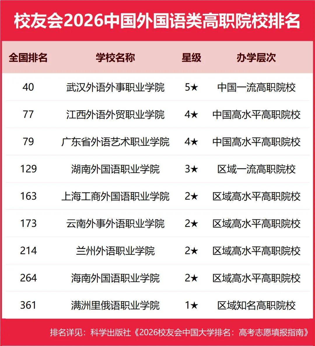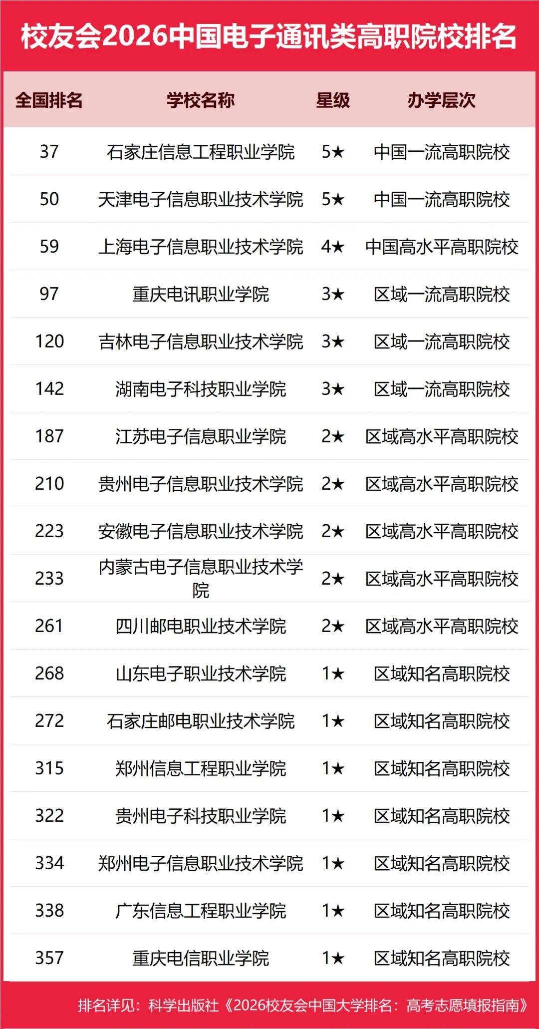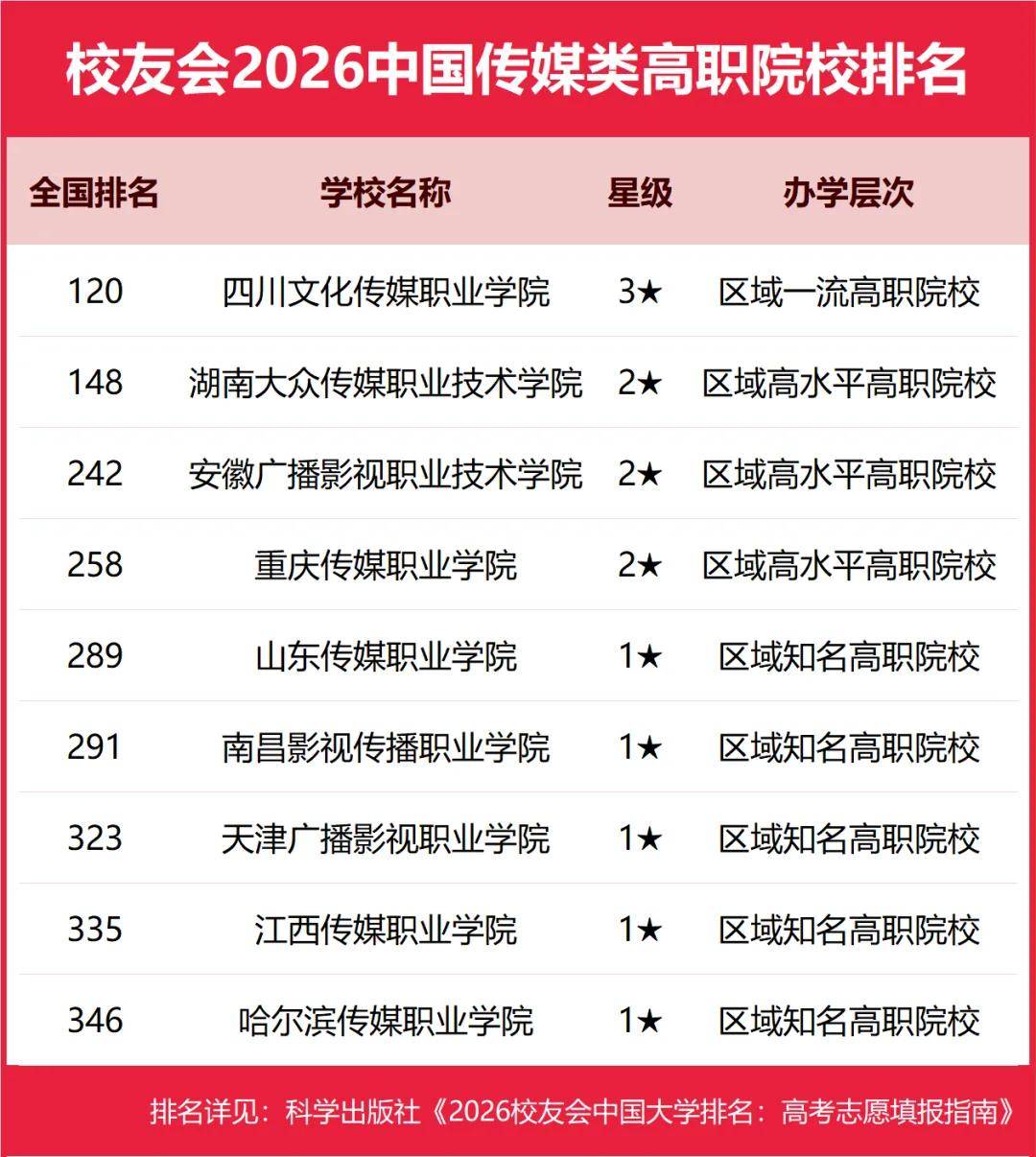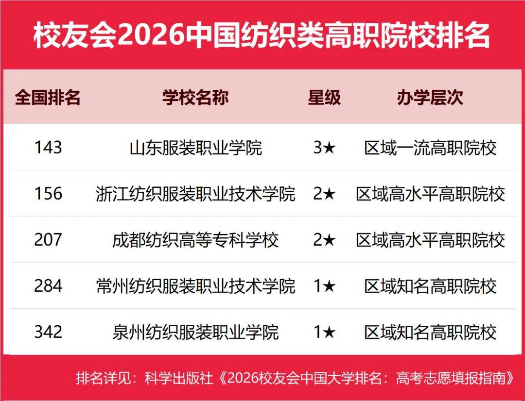 2026年1月12日,全国第三方大学评价机构艾瑞深校友会网(Cuaa.net)正式发布校友会2026中国大学排名和2026中国高职院校排名,至今已连续第24年发布。榜单显示,北京大学办学实力最强,连续20年蝉联中国大学排名榜首,保持霸主地位,问鼎2026中国大学排名榜首。清华大学第2,中国科学院大学和浙江大学并列第3。由艾瑞深研究团队撰写的《2026校友会中国大学排名:高考志愿填报指南》一书将由“科学出版社”公开出版发行。 在2026中国高职院校排名中,江西应用技术职业学院、南京信息职业技术学院、常州信息职业技术学院位列2026中国高职院校排名I类前3强。合肥职业技术学院、襄阳职业技术学院、商丘职业技术学院位列2026中国高职院校排名Ⅱ类前3强。浙江金融职业学院、山东医学高等专科学校、江苏经贸职业技术学院位列2026中国高职院校排名Ⅲ类前3强。 其中,江西新能源科技职业学院、洛阳科技职业学院、广东亚视演艺职业学院、广东岭南职业技术学院、泉州海洋职业学院雄居2026中国民办高职院校排名前5强。 中国民办高校按照研究型和应用型2个类型进行评价。在校友会2026中国民办大学排名中,西湖大学与C9高校哈尔滨工业大学并列全国第12,雄居2026中国民办大学排名(研究型)榜首,福建福耀科技大学第2,挺进全国50强;宁波东方理工大学第3。武昌首义学院、三亚学院、西安欧亚学院、广州南方学院问鼎2026中国民办大学排名(应用型)第一。 西交利物浦大学、宁波诺丁汉大学、香港中文大学(深圳)位列2026中国合作办学大学排名前3强。深圳职业技术大学、海南科技职业大学、河北科技工程职业技术大学雄居2026中国职业技术大学排名前3强。 校友会中国大学排名首发于2003年,至今已有24年的历史,已成为具有广泛社会影响力、公信力、参考价值与创新力的中国大学排名领先品牌。 科学出版社《2026校友会中国大学排名:高考志愿填报指南》 高等职业院校是中国高等教育的重要组成部分,担负着为国家地方经济社会发展培养面向生产、建设、服务、管理第一线需要的高素质应用技术型和职业技能型人才的使命。校友会中国高职院校排名首发于2021年,至今已有6年的历史。按照校友会2026中国大学分类体系标准,将高职院校划分为技能型类型。 在最新校友会2026中国高职院校排名中,根据参评高校优势学科专业所属门类,将中国高职(专科)院校分为I类、Ⅱ类和Ⅲ类等3个类型分别进行评价。其中,Ⅰ类高职院校为以工学门类学科专业为优势的高校,Ⅱ类高职院校为以理学及人文社科门类学科专业为优势的高校,Ⅲ类高职院校为以艺术、体育、经济、管理、农学、教育学、医学等门类学科专业为优势的高校。 校友会2026中国大学排名评价指标体系 江西应用技术职业学院雄居2026中国高职院校排名I类榜首,常州信息职业技术学院前三 在校友会2026中国高职院校排名(I类)中,江西应用技术职业学院综合实力最强,雄居校友会2026中国高职院校排名(I类)榜首。南京信息职业技术学院第2,常州信息职业技术学院第3,陕西铁路工程职业技术学院第4,北京工业职业技术学院第5,四川交通职业技术学院第6,常州机电职业技术学院第7,山东职业学院第8,包头轻工职业技术学院第9,平顶山工业职业技术学院第10。 合肥职业技术学院问鼎2026中国高职院校排名Ⅱ类冠军,襄阳职业技术学院第二 在2026中国高职院校排名(Ⅱ类)中,合肥职业技术学院综合实力最强,雄居校友会2026中国高职院校排名(Ⅱ类)首位。襄阳职业技术学院第2,商丘职业技术学院第3,天津轻工职业技术学院第4,烟台职业学院第5,重庆工商职业学院第6,潍坊职业学院第7,威海职业学院第8,陕西职业技术学院第9,湖北职业技术学院第10。 浙江金融职业学院问鼎2026中国高职院校排名Ⅲ类冠军,广东科贸职业学院前十 在2026中国高职院校排名(Ⅲ类)中,浙江金融职业学院办学实力最强,问鼎校友会2026中国高职院校排名(Ⅲ类)榜首。山东医学高等专科学校第2,江苏经贸职业技术学院第3,江苏农林职业技术学院第4,江苏农牧科技职业学院第5,厦门海洋职业技术学院第6,江西环境工程职业学院第7,江西财经职业学院第8,江西旅游商贸职业学院第9,广东科贸职业学院第10。 江西新能源科技职业学院雄居2026中国民办高职院校排名第一,洛阳科技职业学院第二 在校友会2026中国民办高职院校排名中,江西新能源科技职业学院综合实力最强,位居第15名,雄居2026中国民办高职院校排名首位。洛阳科技职业学院第2,广东亚视演艺职业学院第3,广东岭南职业技术学院第4,泉州海洋职业学院第5,德州科技职业学院第6,重庆交通职业学院第7,郑州城市职业学院第8,四川科技职业学院、广西英华国际职业学院并列第9。 合肥职业技术学院、浙江金融职业学院、山东医学高等专科学校、武汉外语外事职业学院等位列2026中国各类型高职院校排名首位 在最新2026中国各类型高职院校排名中,江西应用技术职业学院问鼎理工类高职院校排名第一,浙江金融职业学院荣登财经类高职院校排名第一,合肥职业技术学院雄居综合类高职院校排名第一,山东医学高等专科学校稳居医药类高职院校排名第一,广东亚视演艺职业学院问鼎艺术类高职院校排名第一。 江苏农林职业技术学院雄居农林类高职院校排名第一,湖南民族职业学院雄居民族类高职院校排名第一,铜仁幼