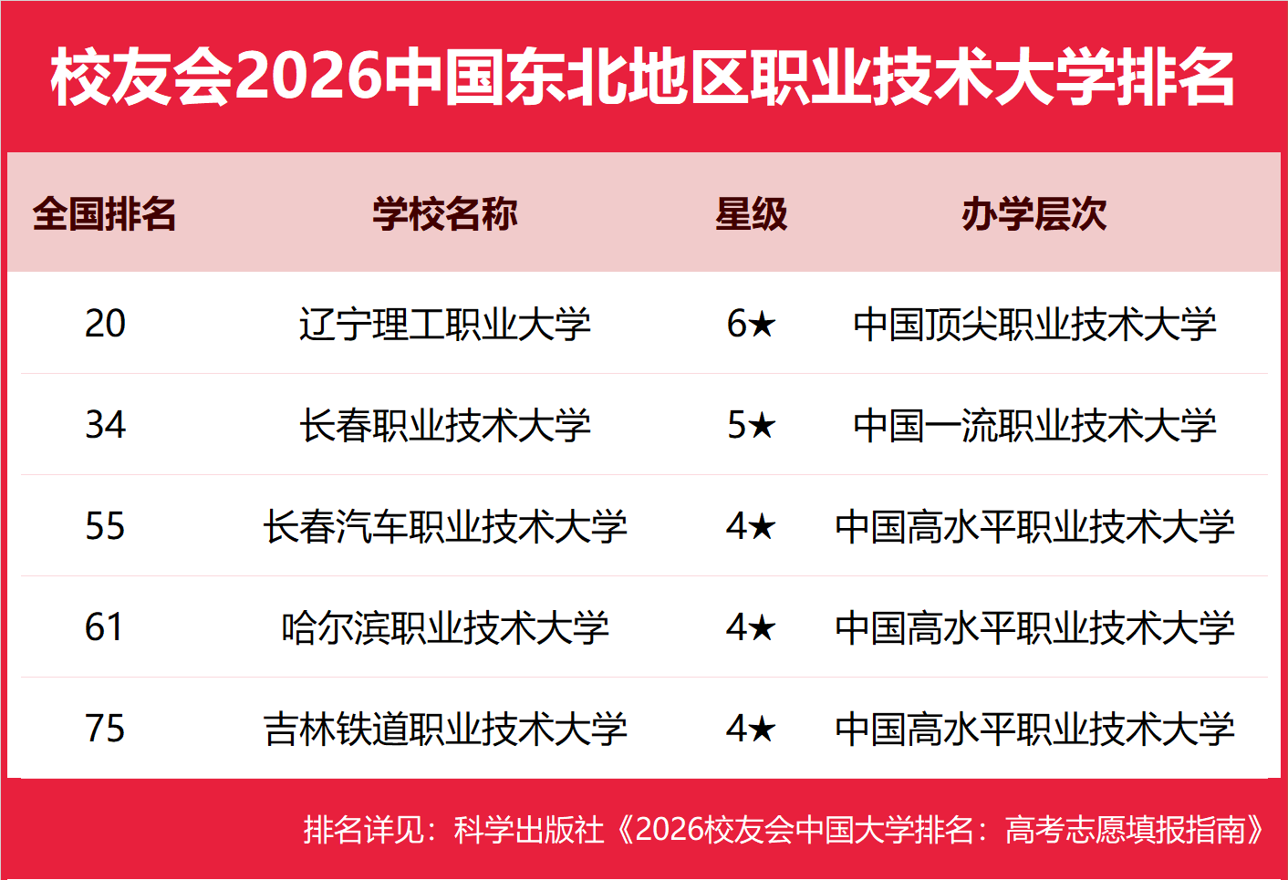 为了给2026年全国高考考生报考中国东北地区高校提供参考指南,2026年1月12日,全国第三方大学评价机构艾瑞深校友会网(Cuaa.net)撰写完成、科学出版社即将出版的《2026校友会中国大学排名:高考志愿填报指南》最新发布校友会2026中国东北地区大学排名。北京大学连续20年蝉联中国大学排名冠军,稳居霸主地位,问鼎2026中国大学排名榜首。清华大学第二,中国科学院大学和浙江大学并列第三,西湖大学、南方科技大学和上海科技大学挺进全国20强;福耀科技大学首次纳入中国大学排名,跻身全国50强。 科学出版社《2026校友会中国大学排名:高考志愿填报指南》 榜单显示,哈尔滨工业大学问鼎校友会2026中国东北地区大学排名首位,沈阳城市学院、长春财经学院并列2026中国东北地区民办大学排名第一,辽宁理工职业大学位居2026中国东北地区职业技术大学排名榜首,浙江金融职业学院问鼎2026中国东北地区高职院校排名冠军。 西交利物浦大学、宁波诺丁汉大学、香港中文大学(深圳)位列2026中国合作办学大学排名前三甲。武昌首义学院、三亚学院、西安欧亚学院、广州南方学院位列2026中国民办大学排名首位。深圳职业技术大学、海南科技职业大学、河北科技工程职业技术大学雄居2026中国职业技术大学排名前三甲。江西应用技术职业学院、合肥职业技术学院、浙江金融职业学院位列2026中国高职院校排名榜首。 校友会2026中国大学排名评价指标体系 哈尔滨工业大学雄居2026中国东北地大学排名第一,哈尔滨工程大学挺进前10强 在最新校友会2026中国大学排名中,哈尔滨工业大学全国排名第12名,雄居2026中国东北地区大学排名第一。吉林大学第2,大连理工大学第3。名列前10强的其他高校为东北大学、哈尔滨工程大学、东北师范大学、哈尔滨医科大学、东北财经大学、东北林业大学、东北农业大学。 沈阳城市学院、长春财经学院并列2026中国东北地区民办大学排名第一,长春光华学院跻身前10强 在校友会2026中国民办大学排名中,沈阳城市学院、长春财经学院全国排名第5名,雄居2026中国东北地区民办大学排名并列第一。黑龙江外国语学院居第3。名列前10强的其他民办高校为长春光华学院、辽宁传媒学院、黑龙江财经学院、吉林建筑科技学院、长春建筑学院、哈尔滨华德学院、长春电子科技学院。 辽宁理工职业大学雄居2026中国东北地区职业技术大学排名第一,长春汽车职业技术大学跻身前3强 在校友会2026中国职业技术大学排名中,辽宁理工职业大学全国排名第1名,雄居2026中国东北地区职业技术大学排名第一。长春职业技术大学列第2,长春汽车职业技术大学居第3。名列前10强的其他职业技术大学为哈尔滨职业技术大学、吉林铁道职业技术大学。 辽宁医药职业学院雄居2026中国东北地区高职院校排名第一,沈阳职业技术学院跻身前3强 在校友会2026中国高职院校排名中,辽宁医药职业学院全国排名第13名,雄居2026中国东北地区高职院校排名第一。沈阳职业技术学院第2,大连职业技术学院第3。名列前10强的其他高职院校为辽宁省交通高等专科学校、黑龙江职业学院、吉林交通职业技术学院、黑龙江农业经济职业学院、辽宁农业职业技术学院、黑龙江农业工程职业学院、白城医学高等专科学校。 |