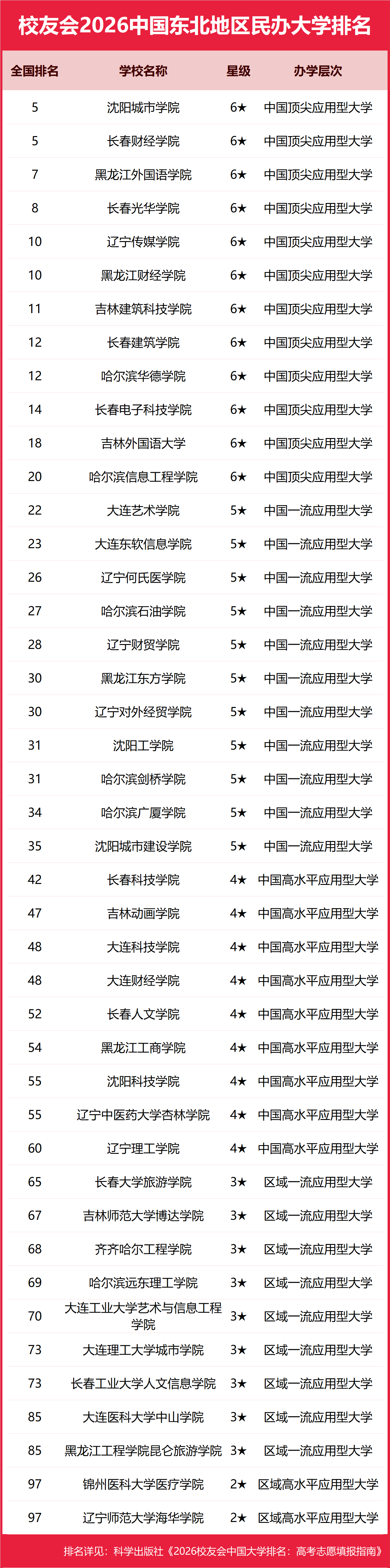 | 校友会2026年中国东北地区大学排名,哈尔滨工业大学、沈阳城市学院、长春财经学院、辽宁理工职业大学、辽宁医药职业学院第一 | |||