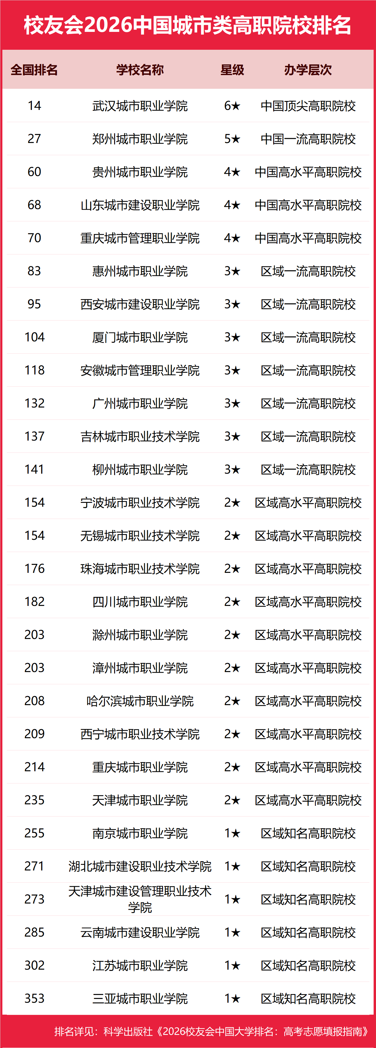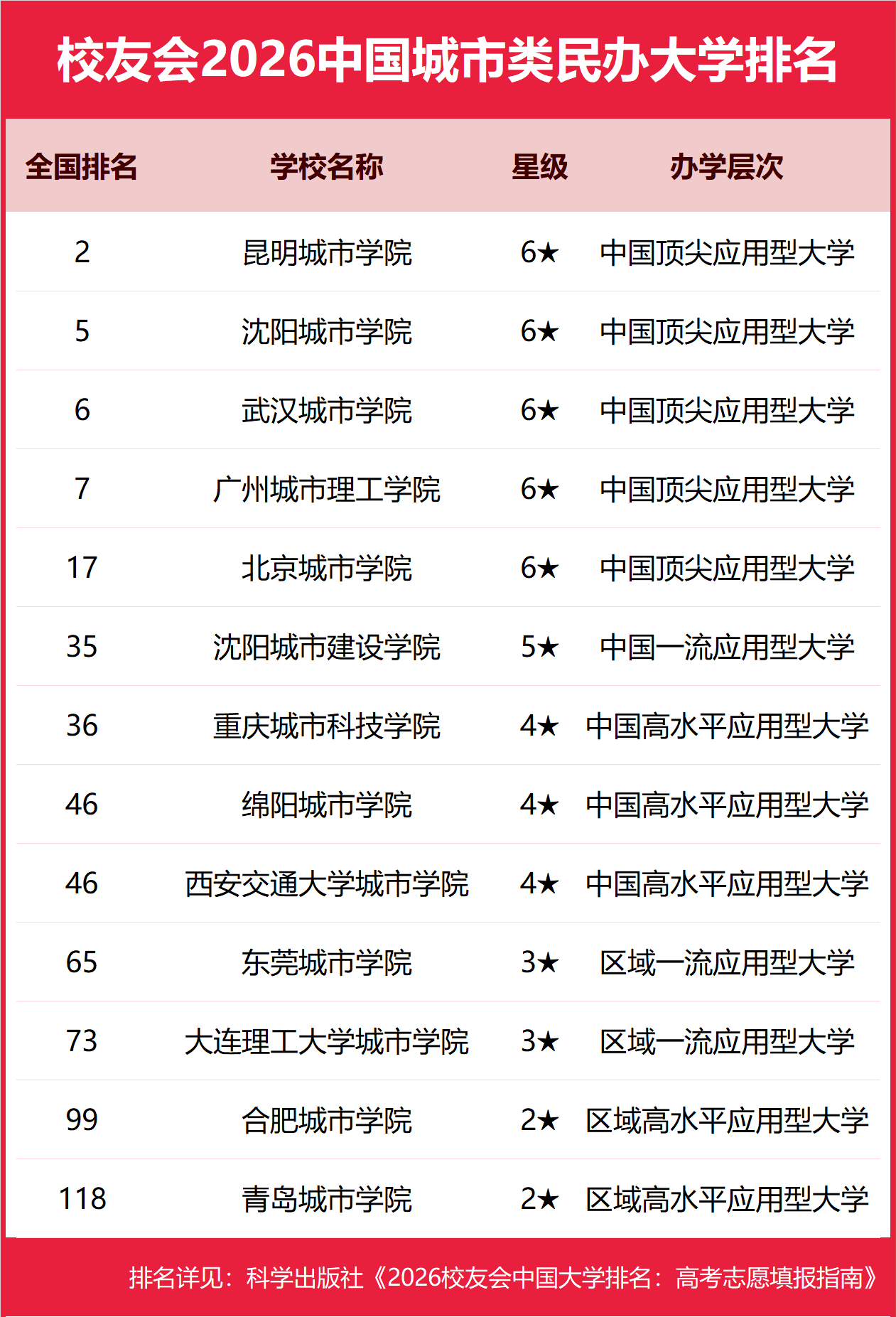为了给2026年全国高考考生报考中国城市类高校提供参考指南,2026年1月12日,全国第三方大学评价机构艾瑞深校友会网(Cuaa.net)撰写完成、科学出版社即将出版的《2026校友会中国大学排名:高考志愿填报指南》最新发布校友会2026中国城市类大学排名。北京大学连续20年蝉联中国大学排名冠军,稳居霸主地位,问鼎2026中国大学排名榜首。清华大学第二,中国科学院大学和浙江大学并列第三,南开大学挺进全国前七,西湖大学、南方科技大学和上海科技大学挺进全国20强;福耀科技大学首次纳入中国大学排名,跻身全国50强。 科学出版社《2026校友会中国大学排名:高考志愿填报指南》 榜单显示,香港城市大学(东莞)问鼎校友会2026中国城市类大学排名首位,昆明城市学院位列2026中国城市类民办大学排名第一,武汉城市职业学院问鼎2026中国城市类高职院校排名冠军。 西交利物浦大学、宁波诺丁汉大学、香港中文大学(深圳)位列2026中国合作办学大学排名前三甲。武昌首义学院、三亚学院、西安欧亚学院、广州南方学院位列2026中国民办大学排名首位。深圳职业技术大学、海南科技职业大学、河北科技工程职业技术大学雄居2026中国职业技术大学排名前三甲。江西应用技术职业学院、合肥职业技术学院、浙江金融职业学院位列2026中国高职院校排名榜首。 校友会2026中国大学排名评价指标体系 香港城市大学(东莞)雄居2026中国城市类大学排名第一,苏州城市学院挺进前10强 在最新校友会2026中国大学排名中,香港城市大学(东莞)全国排名第134名,雄居2026中国城市类大学排名第一。湖南城市学院第2,兰州城市学院第3。名列前10强的其他高校为浙大城市学院、苏州城市学院。 昆明城市学院雄居2026中国城市类民办大学排名第一,武汉城市学院跻身前3强 在校友会2026中国民办大学排名中,昆明城市学院全国排名第2名,雄居2026中国城市类民办大学排名第一。沈阳城市学院第2,武汉城市学院居第3。名列前10强的其他民办高校为广州城市理工学院、北京城市学院、沈阳城市建设学院、重庆城市科技学院、绵阳城市学院、西安交通大学城市学院、东莞城市学院。 武汉城市职业学院雄居2026中国城市类高职院校排名第一,郑州城市职业学院跻身前3强 在校友会2026中国高职院校排名中,山东商业职业技术学院全国排名第1名,雄居2026中国城市类高职院校排名第一。郑州城市职业学院第2,贵州城市职业学院第3。名列前10强的其他高职院校为山东城市建设职业学院、重庆城市管理职业学院、惠州城市职业学院、西安城市建设职业学院、厦门城市职业学院、安徽城市管理职业学院、广州城市职业学院。 |