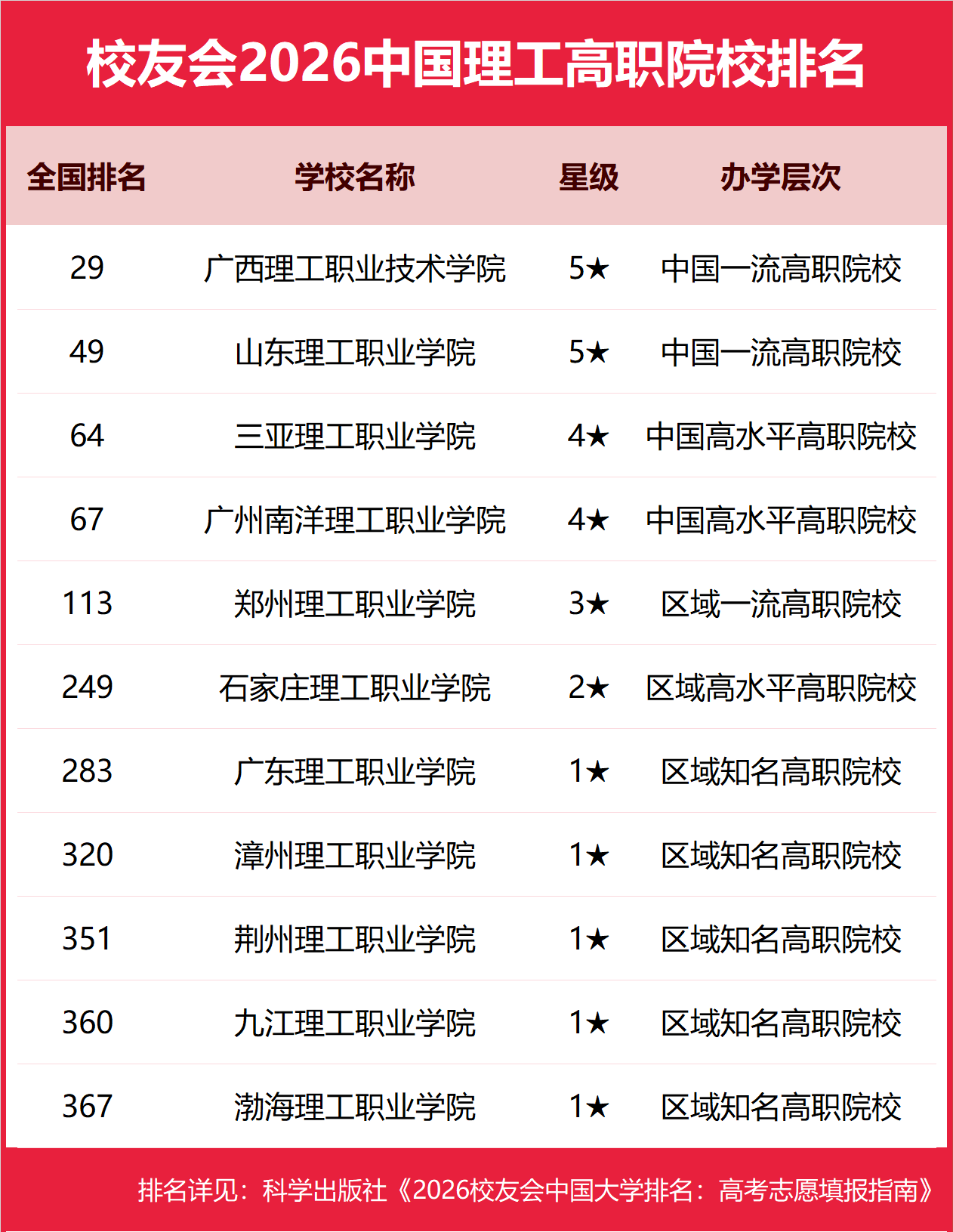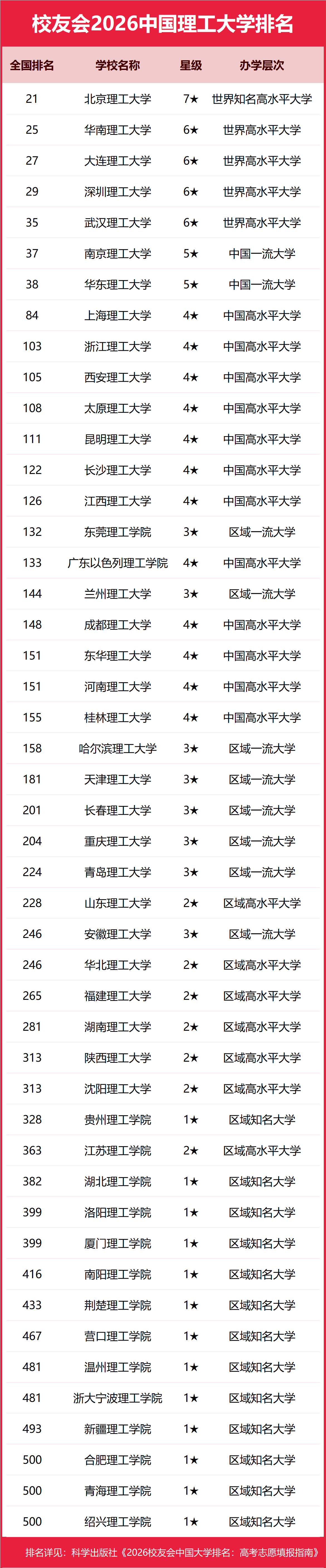 为了给2026年全国高考考生报考中国理工高校提供参考指南,2026年1月12日,全国第三方大学评价机构艾瑞深校友会网(Cuaa.net)撰写完成、科学出版社即将出版的《2026校友会中国大学排名:高考志愿填报指南》最新发布校友会2026中国理工大学排名。北京大学连续20年蝉联中国大学排名冠军,稳居霸主地位,问鼎2026中国大学排名榜首。清华大学第二,中国科学院大学和浙江大学并列第三,南开大学挺进全国前七,西湖大学、南方科技大学和上海科技大学挺进全国20强;福耀科技大学首次纳入中国大学排名,跻身全国50强。 科学出版社《2026校友会中国大学排名:高考志愿填报指南》 榜单显示,北京理工大学问鼎校友会2026中国理工大学排名首位,齐鲁理工学院位列2026中国民办理工大学排名第一,广西理工职业技术学院问鼎2026中国理工高职院校排名冠军。 西交利物浦大学、宁波诺丁汉大学、香港中文大学(深圳)位列2026中国合作办学大学排名前三甲。武昌首义学院、三亚学院、西安欧亚学院、广州南方学院位列2026中国民办大学排名首位。深圳职业技术大学、海南科技职业大学、河北科技工程职业技术大学雄居2026中国职业技术大学排名前三甲。江西应用技术职业学院、合肥职业技术学院、浙江金融职业学院位列2026中国高职院校排名榜首。 校友会2026中国大学排名评价指标体系 北京理工大学雄居2026中国理工大学排名第一,深圳理工大学挺进前5强 在最新校友会2026中国大学排名中,北京理工大学全国排名第21名,雄居2026中国理工大学排名第一。华南理工大学第2,大连理工大学第3。名列前10强的其他高校为深圳理工大学、武汉理工大学、南京理工大学、华东理工大学、上海理工大学、浙江理工大学、西安理工大学。 齐鲁理工学院雄居2026中国民办理工大学排名第一,武汉华夏理工学院跻身前10强 在校友会2026中国民办大学排名中,齐鲁理工学院全国排名第3名,雄居2026中国民办理工大学排名第一。南昌理工学院第2,广州城市理工学院居第3。名列前10强的其他民办高校为武汉华夏理工学院、广州理工学院、福州理工学院、武昌理工学院、保定理工学院、闽南理工学院、山西晋中理工学院。 广西理工职业技术学院雄居2026中国理工高职院校排名第一,山东理工职业学院跻身前3强 在校友会2026中国高职院校排名中,广西理工职业技术学院全国排名第29名,雄居2026中国理工高职院校排名第一。山东理工职业学院第2,三亚理工职业学院第3。名列前10强的其他高职院校为广州南洋理工职业学院、郑州理工职业学院、石家庄理工职业学院、广东理工职业学院、漳州理工职业学院、荆州理工职业学院、九江理工职业学院。 |