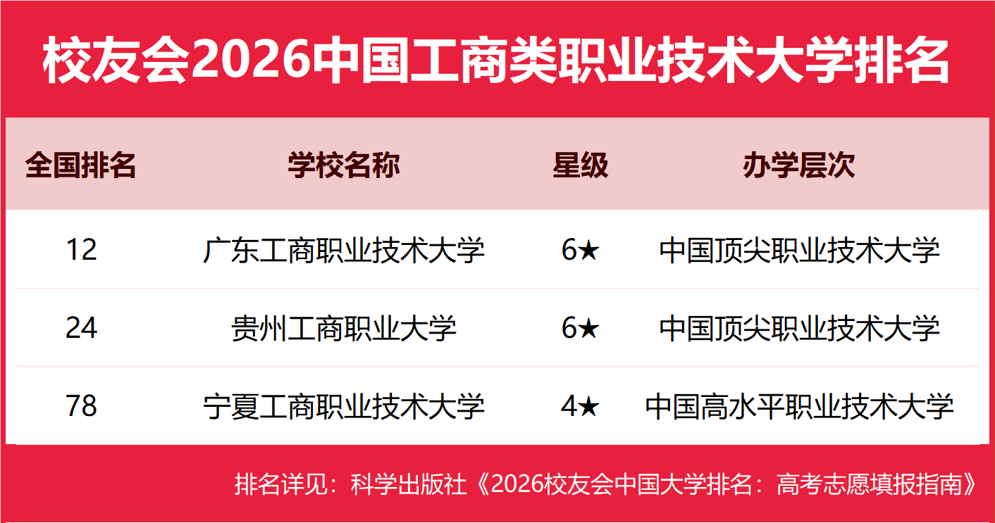 | 校友会2026中国工商类大学排名,浙江工商大学、武汉工商学院、广东工商职业技术大学、重庆工商职业学院第一 | |||