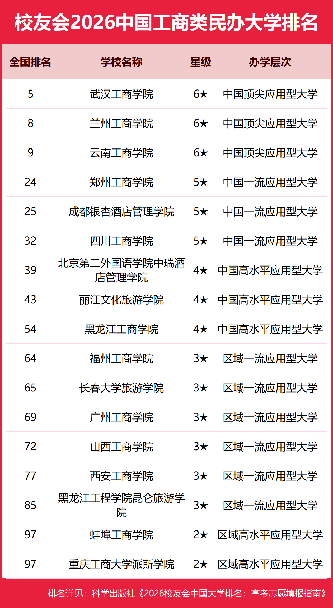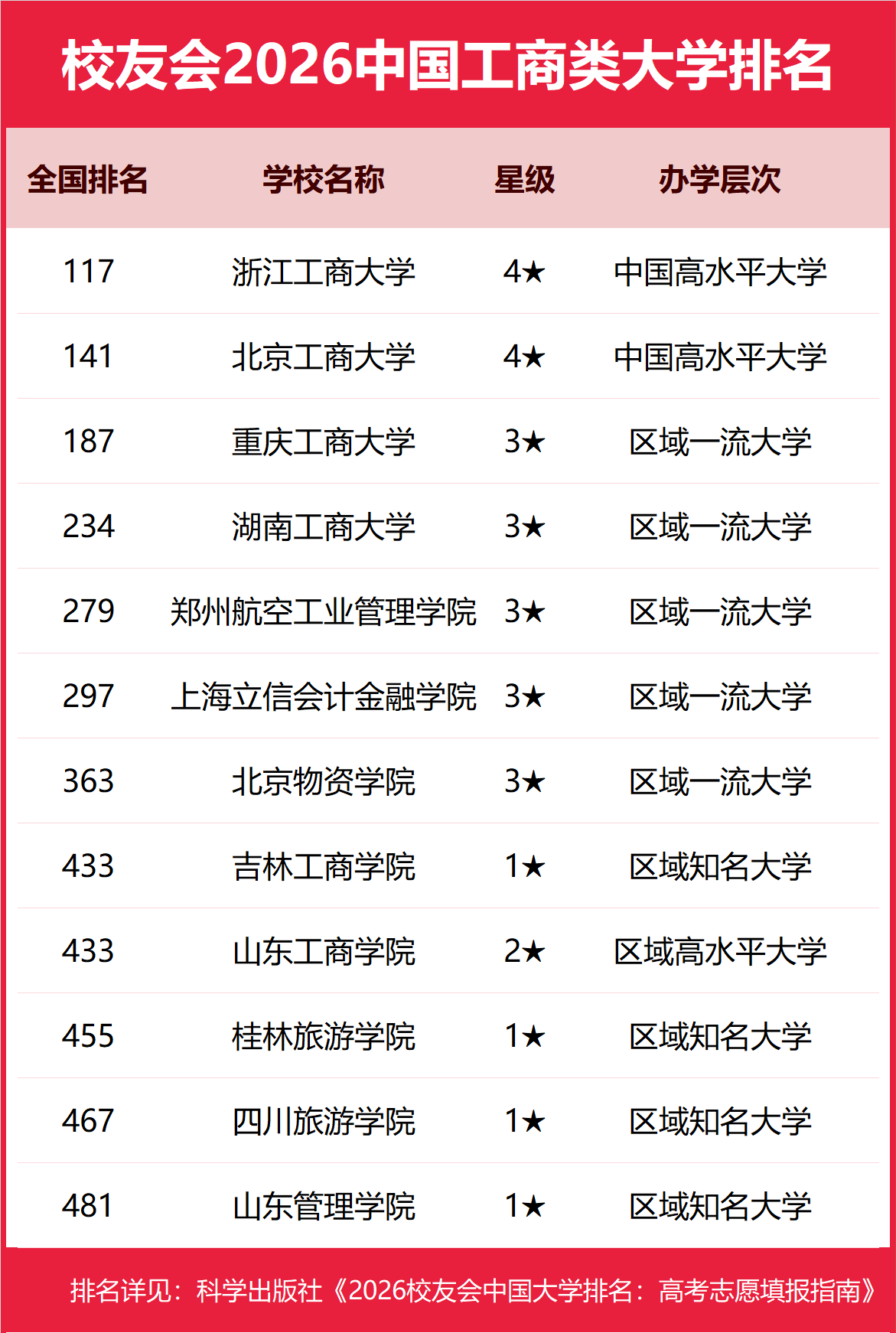 为了给2026年全国高考考生报考中国工商类高校提供参考指南,2026年1月12日,全国第三方大学评价机构艾瑞深校友会网(Cuaa.net)撰写完成、科学出版社即将出版的《2026校友会中国大学排名:高考志愿填报指南》最新发布校友会2026中国工商类大学排名。北京大学连续20年蝉联中国大学排名冠军,稳居霸主地位,问鼎2026中国大学排名榜首。清华大学第二,中国科学院大学和浙江大学并列第三,南开大学挺进全国前七,西湖大学、南方科技大学和上海科技大学挺进全国20强;福耀科技大学首次纳入中国大学排名,跻身全国50强。 科学出版社《2026校友会中国大学排名:高考志愿填报指南》 榜单显示,浙江工商大学问鼎校友会2026中国工商类大学排名首位,武汉工商学院位列2026中国工商类民办大学排名第一,广东工商职业技术大学位居2026中国工商类职业技术大学排名榜首,重庆工商职业学院问鼎2026中国工商类高职院校排名冠军。 西交利物浦大学、宁波诺丁汉大学、香港中文大学(深圳)位列2026中国合作办学大学排名前三甲。武昌首义学院、三亚学院、西安欧亚学院、广州南方学院位列2026中国民办大学排名首位。深圳职业技术大学、海南科技职业大学、河北科技工程职业技术大学雄居2026中国职业技术大学排名前三甲。江西应用技术职业学院、合肥职业技术学院、浙江金融职业学院位列2026中国高职院校排名榜首。 校友会2026中国大学排名评价指标体系 浙江工商大学雄居2026中国工商类大学排名第一,吉林工商学院挺进前10强 在最新校友会2026中国大学排名中,浙江工商大学全国排名第117名,雄居2026中国工商类大学排名第一。北京工商大学第2,重庆工商大学第3。名列前10强的其他高校为湖南工商大学、郑州航空工业管理学院、上海立信会计金融学院、北京物资学院、吉林工商学院、山东工商学院、桂林旅游学院。 武汉工商学院雄居2026中国工商类民办大学排名第一,成都银杏酒店管理学院跻身前5强 在校友会2026中国民办大学排名中,武汉工商学院全国排名第5名,雄居2026中国工商类民办大学排名第一。兰州工商学院第2,云南工商学院居第3。名列前10强的其他民办高校为郑州工商学院、成都银杏酒店管理学院、四川工商学院、北京第二外国语学院中瑞酒店管理学院、丽江文化旅游学院、黑龙江工商学院、福州工商学院。 广东工商职业技术大学雄居2026中国工商类职业技术大学排名第一,宁夏工商职业技术大学跻身前3强 在校友会2026中国职业技术大学排名中,广东工商职业技术大学全国排名第12名,雄居2026中国工商类职业技术大学排名第一。贵州工商职业大学列第2,宁夏工商职业技术大学居第3。 重庆工商职业学院雄居2026中国工商类高职院校排名第一,江西旅游商贸职业学院跻身前3强 在校友会2026中国高职院校排名中,重庆工商职业学院全国排名第6名,雄居2026中国工商类高职院校排名第一。江西旅游商贸职业学院第2,浙江旅游职业学院第3。名列前10强的其他高职院校为郑州旅游职业学院、青岛酒店管理职业技术学院、广东农工商职业技术学院、长沙商贸旅游职业技术学院、安徽工商职业学院、安徽工商职业学院、重庆城市管理职业学院、上海旅游高等专科学校。 |
