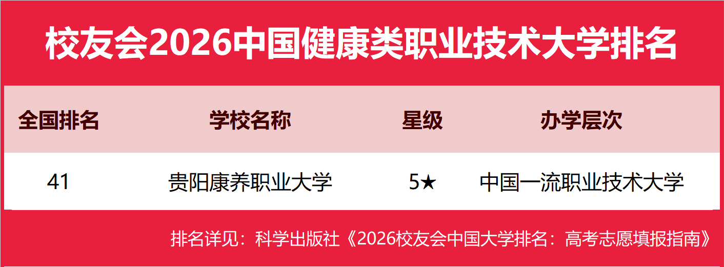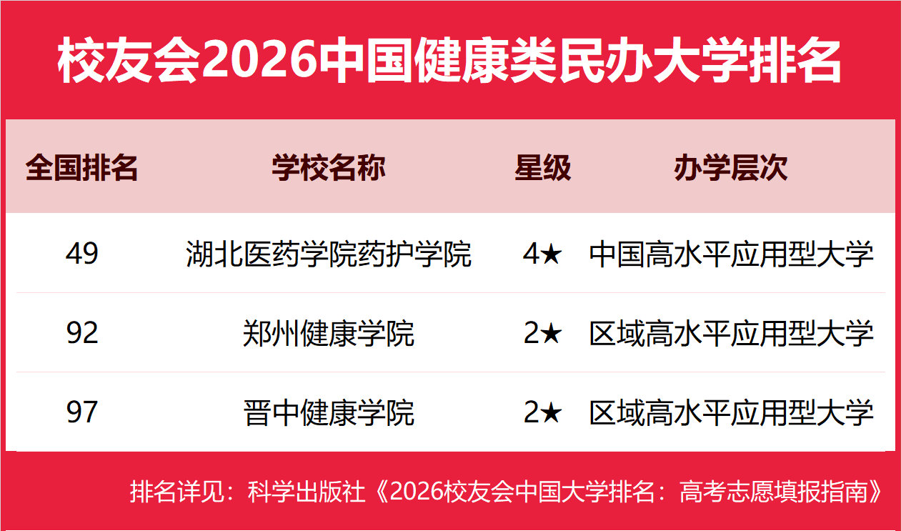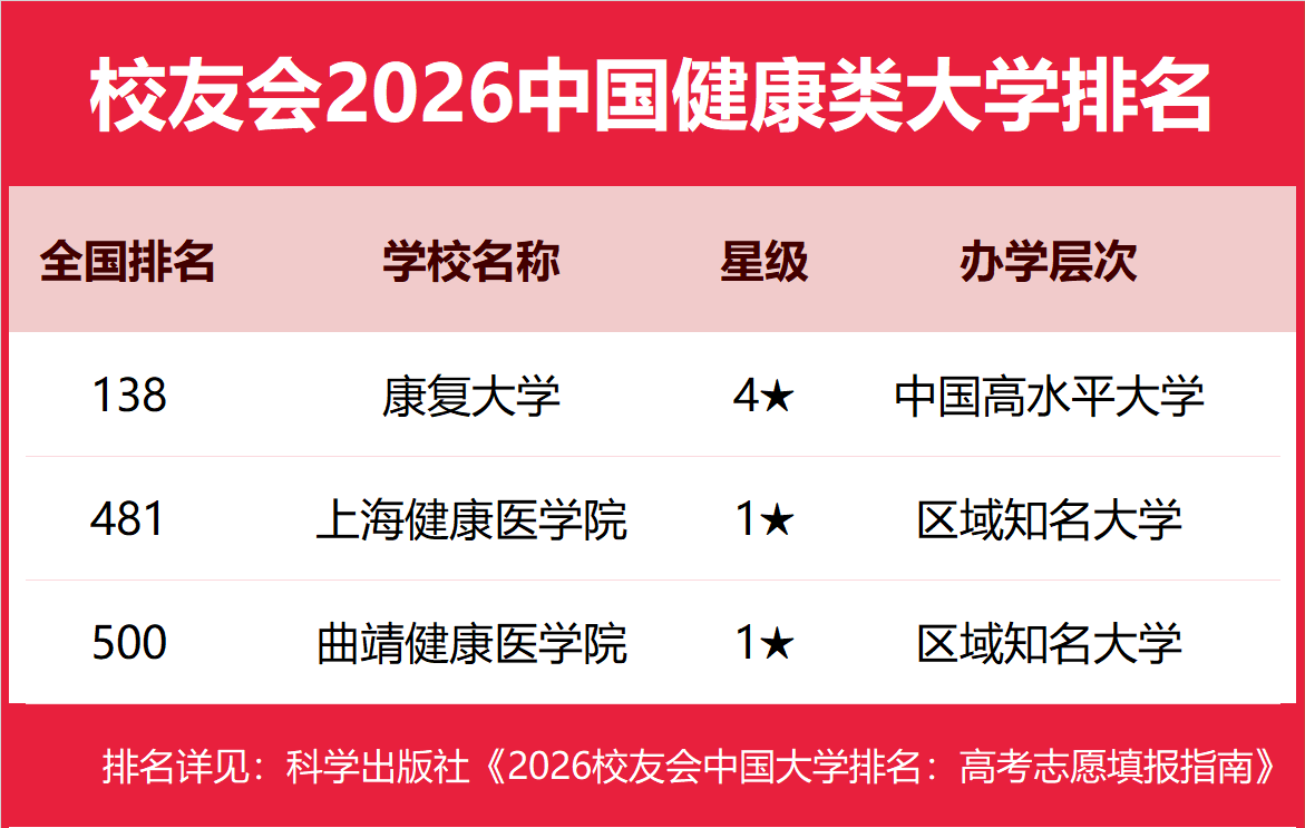 为了给2026年全国高考考生报考中国健康类高校提供参考指南,2026年1月12日,全国第三方大学评价机构艾瑞深校友会网(Cuaa.net)撰写完成、科学出版社即将出版的《2026校友会中国大学排名:高考志愿填报指南》最新发布校友会2026中国健康类大学排名。北京大学连续20年蝉联中国大学排名冠军,稳居霸主地位,问鼎2026中国大学排名榜首。清华大学第二,中国科学院大学和浙江大学并列第三,西湖大学、南方科技大学和上海科技大学挺进全国20强;福耀科技大学首次纳入中国大学排名,跻身全国50强。 科学出版社《2026校友会中国大学排名:高考志愿填报指南》 榜单显示,康复大学问鼎校友会2026中国健康类大学排名首位,湖北医药学院药护学院位列2026中国健康类民办大学排名第一,贵阳康养职业大学位居2026中国健康类职业技术大学排名榜首,四川护理职业学院问鼎2026中国健康类高职院校排名冠军。 西交利物浦大学、宁波诺丁汉大学、香港中文大学(深圳)位列2026中国合作办学大学排名前三甲。武昌首义学院、三亚学院、西安欧亚学院、广州南方学院位列2026中国民办大学排名首位。深圳职业技术大学、海南科技职业大学、河北科技工程职业技术大学雄居2026中国职业技术大学排名前三甲。江西应用技术职业学院、合肥职业技术学院、浙江金融职业学院位列2026中国高职院校排名榜首。 校友会2026中国大学排名评价指标体系 康复大学雄居2026中国健康类大学排名第一,曲靖健康医学院挺进前3强 在最新校友会2026中国大学排名中,康复大学全国排名第138名,雄居2026中国健康类大学排名第一。上海健康医学院第2,曲靖健康医学院第3。 湖北医药学院药护学院雄居2026中国健康类民办大学排名第一,郑州健康学院跻身前10强 在校友会2026中国民办大学排名中,湖北医药学院药护学院全国排名第49名,雄居2026中国健康类民办大学排名第一。郑州健康学院第2,晋中健康学院居第3。 贵阳康养职业大学雄居2026中国健康类职业技术大学排名第一 在校友会2026中国职业技术大学排名中,贵阳康养职业大学全国排名第41名,雄居2026中国健康类职业技术大学排名第一。 四川护理职业学院雄居2026中国健康类高职院校排名第一,四川卫生康复职业学院跻身前3强 在校友会2026中国高职院校排名中,四川护理职业学院全国排名第106名,雄居2026中国健康类高职院校排名第一。四川卫生康复职业学院第2,贵州护理职业技术学院第3。名列前10强的其他高职院校为赣南卫生健康职业学院、贵州健康职业学院、江苏卫生健康职业学院、承德护理职业学院、黑龙江护理高等专科学校、江苏护理职业学院、运城护理职业学院。 |