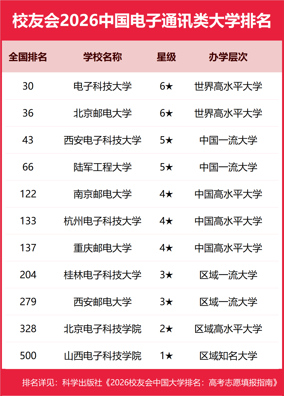 为了给2026年全国高考考生报考中国电子通讯类高校提供参考指南,2026年1月12日,全国第三方大学评价机构艾瑞深校友会网(Cuaa.net)撰写完成、科学出版社即将出版的《2026校友会中国大学排名:高考志愿填报指南》最新发布校友会2026中国电子通讯类大学排名。北京大学连续20年蝉联中国大学排名冠军,稳居霸主地位,问鼎2026中国大学排名榜首。清华大学第二,中国科学院大学和浙江大学并列第三,西湖大学、南方科技大学和上海科技大学挺进全国20强;福耀科技大学首次纳入中国大学排名,跻身全国50强。 科学出版社《2026校友会中国大学排名:高考志愿填报指南》 榜单显示,电子科技大学问鼎校友会2026中国电子通讯类大学排名首位,电子科技大学成都学院位列2026中国电子通讯类民办大学排名第一,石家庄信息工程职业学院问鼎2026中国电子通讯类高职院校排名冠军。 西交利物浦大学、宁波诺丁汉大学、香港中文大学(深圳)位列2026中国合作办学大学排名前三甲。武昌首义学院、三亚学院、西安欧亚学院、广州南方学院位列2026中国民办大学排名首位。深圳职业技术大学、海南科技职业大学、河北科技工程职业技术大学雄居2026中国职业技术大学排名前三甲。江西应用技术职业学院、合肥职业技术学院、浙江金融职业学院位列2026中国高职院校排名榜首。 校友会2026中国大学排名评价指标体系 电子科技大学雄居2026中国电子通讯类大学排名第一,南京邮电大学挺进前10强 在最新校友会2026中国大学排名中,电子科技大学全国排名第30名,雄居2026中国电子通讯类大学排名第一。北京邮电大学第2,西安电子科技大学第3。名列前10强的其他高校为陆军工程大学、南京邮电大学、杭州电子科技大学、重庆邮电大学、桂林电子科技大学、西安邮电大学、北京电子科技学院。 电子科技大学成都学院雄居2026中国电子通讯类民办大学排名第一,长春电子科技学院第2 在校友会2026中国民办大学排名中,电子科技大学成都学院全国排名第10名,雄居2026中国电子通讯类民办大学排名第一。长春电子科技学院第2,北京邮电大学世纪学院居第3。名列前10强的其他民办高校为南京邮电大学通达学院、安徽信息工程学院、安徽文达信息工程学院、桂林信息科技学院、天津理工大学中环信息学院、晋中信息学院、杭州电子科技大学信息工程学院。 石家庄信息工程职业学院雄居2026中国电子通讯类高职院校排名第一,天津电子信息职业技术学院跻身前3强 在校友会2026中国高职院校排名中,石家庄信息工程职业学院全国排名第37名,雄居2026中国电子通讯类高职院校排名第一。天津电子信息职业技术学院第2,上海电子信息职业技术学院第3。名列前10强的其他高职院校为重庆电讯职业学院、吉林电子信息职业技术学院、湖南电子科技职业学院、江苏电子信息职业学院、贵州电子信息职业技术学院、安徽电子信息职业技术学院、内蒙古电子信息职业技术学院。 |