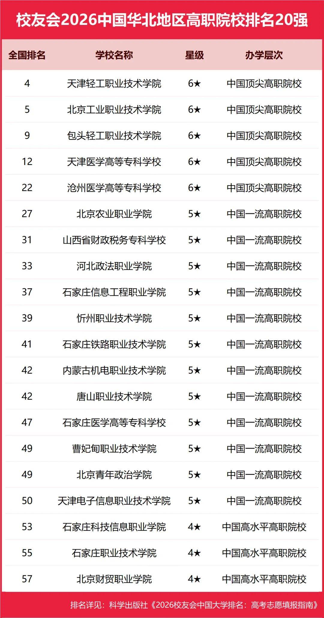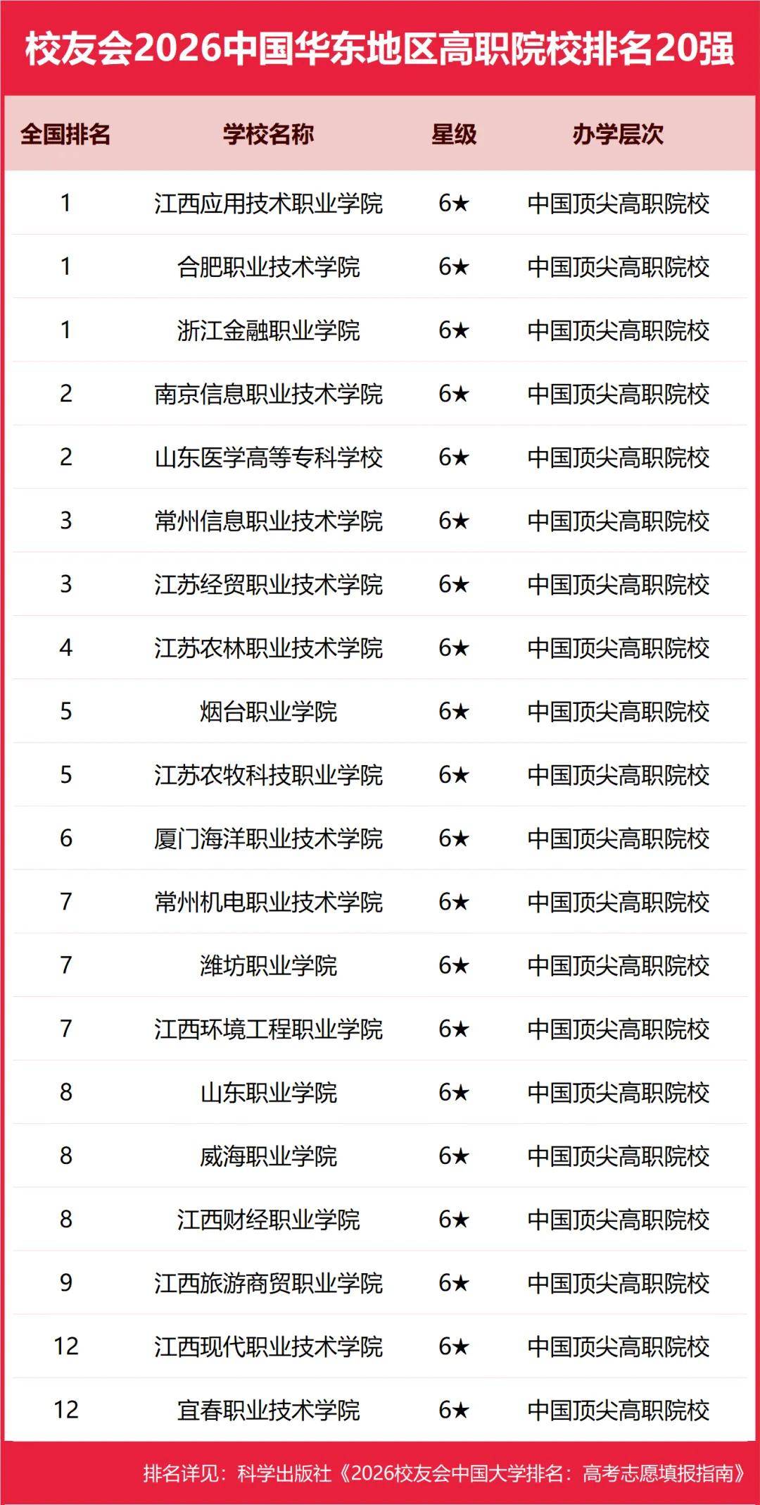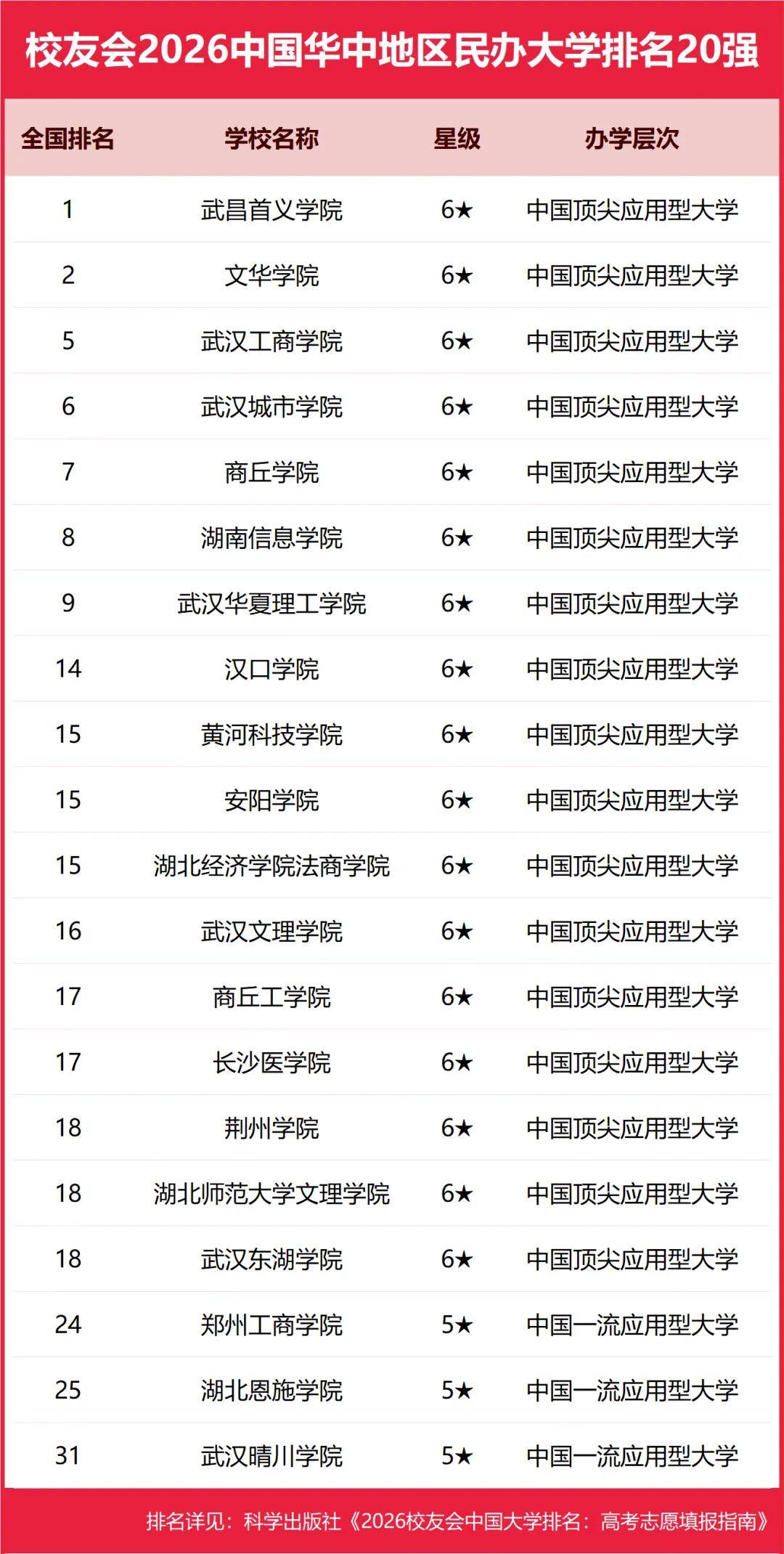 为了给2026年全国考生及家长提供志愿填报参考指南,1月12日,全国第三方大学评价研究机构艾瑞深校友会网(Cuaa.net)撰写完成、科学出版社即将公开出版的《2026校友会中国大学排名:高考志愿填报指南》最新发布校友会2026中国各区域大学排名、2026中国各区域民办大学排名、2026中国各区域职业技术大学排名和2026中国各区域高职院校排名。 校友会2026中国各区域大学排名(完整榜单) 华北地区:北京河北内蒙古山西天津 华东地区: 安徽福建江苏江西山东上海浙江 东北地区:黑龙江吉林辽宁 华中地区:河南湖北湖南 华南地区:广东广西 海南 西北地区:甘肃宁夏 青海陕西 新疆 西南地区:西藏贵州四川云南重庆 北京大学综合实力最强,连续20年问鼎中国大学排名冠军,位居校友会2026中国大学排名榜首。清华大学位列第2,中国科学院大学与浙江大学并列第3,南开大学跻身全国前7强。西湖大学、南方科技大学与上海科技大学跻身全国前20强;福耀科技大学首次纳入中国大学排名,挺进全国50强。 武昌首义学院、文华学院、上海建桥学院和齐鲁理工学院位列校友会2026中国民办大学排名I类前3强。三亚学院、广州南方学院与四川大学锦江学院位列校友会2026中国民办大学排名Ⅱ类前3强。西安欧亚学院、昆明城市学院、福州外语外贸学院与山东协和学院位列校友会2026中国民办大学排名Ⅲ类前3强。 西交利物浦大学、宁波诺丁汉大学和香港中文大学(深圳)位列校友会2026中国合作办学大学排名前3甲。四川大学锦江学院、电子科技大学成都学院和宁波大学科学技术学院位列校友会2026中国独立学院排名前3甲。深圳职业技术大学、海南科技职业大学和河北科技工程职业技术大学位列校友会2026中国职业技术大学排名前3甲。 江西应用技术职业学院、南京信息职业技术学院与常州信息职业技术学院位列校友会2026中国高职院校排名I类前3甲。合肥职业技术学院、襄阳职业技术学院与商丘职业技术学院位列校友会2026中国高职院校排名Ⅱ类前3强。浙江金融职业学院、山东医学高等专科学校与江苏经贸职业技术学院位列校友会2026中国高职院校排名Ⅲ类前3强。 海南科技职业大学、西安汽车职业大学与广东工商职业技术大学位列校友会2026中国民办职业技术大学排名前3甲。江西新能源科技职业学院、洛阳科技职业学院与广东亚视演艺职业学院位列校友会2026中国民办高职院校排名前3甲。 科学出版社《2026校友会中国大学排名:高考志愿填报指南》 校友会中国大学排名首发于2003年,至今已有24年的历史,已成为具有广泛社会影响力、公信力、参考价值与创新力的中国大学排名领先品牌。校友会2026中国大学排名评价指标体系由办学层次、思政教育、学科专业、教学质量、高层次人才、杰出校友、科研项目、科研基地、科研成果、社会服务、社会声誉、国际影响力等12大一级指标组成。 校友会2026中国大学排名评价指标体系 2026中国东北地区大学排名 哈尔滨工业大学问鼎校友会2026中国东北地区大学排名首位 沈阳城市学院、长春财经学院并列2026中国东北地区民办大学排名第一 辽宁理工职业大学位居2026中国东北地区职业技术大学排名榜首 浙江金融职业学院问鼎2026中国东北地区高职院校排名冠军 2026中国华北地区大学排名 北京大学问鼎校友会2026中国华北地区大学排名首位 天津仁爱学院位列2026中国华北地区民办大学排名第一 河北科技工程职业技术大学位居2026中国华北地区职业技术大学排名榜首 天津轻工职业技术学院问鼎2026中国华北地区高职院校排名冠军 2026中国华东地区大学排名 浙江大学问鼎校友会2026中国华东地区大学排名首位 上海建桥学院、齐鲁理工学院、福州外语外贸学院、山东协和学院2026中国华东地区民办大学排名并列第一 芜湖职业技术大学位居2026中国华东地区职业技术大学排名榜首 江西应用技术职业学院、合肥职业技术学院、浙江金融职业学院2026中国华东地区高职院校排名并列冠军 2026中国华南地区大学排名 中山大学问鼎校友会2026中国华南地区大学排名首位 三亚学院、广州南方学院2026中国华南地区民办大学排名并列第一 深圳职业技术大学位居2026中国华南地区职业技术大学排名榜首 广东科贸职业学院问鼎2026中国华南地区高职院校排名冠军 2026中国华中地区大学排名 武汉大学问鼎校友会2026中国华中地区大学排名首位 武昌首义学院位列2026中国华中地区民办大学排名第一 黄河水利职业技术大学、武汉职业技术大学位居2026中国华中地区职业技术大学排名榜首 襄阳职业技术学院问鼎2026中国华中地区高职院校排名冠军 2026中国西北地区大学排名 西安交通大学问鼎校友会2026中国西北地区大学排名首位 西安欧亚学院位列2026中国西北地区民办大学排名第一 兰州资源环境职业技术大学位居2026中国西北地区职业技术大学排名榜首, 浙江金融职业学院问鼎2026中国西北地区高职院校排名冠军 2026中国西南地区大学排名 四川大学问鼎校友会2026中国西南地区大学排名首位 昆明城市学院位列2026中国西南地区民办大学排名第一 贵州工商职业大学位居2026中国西南地区职业技术大学排名榜首 四川交通职业技术学院、重庆工商职业学院问鼎2026中国西南地区高职院校排名冠军